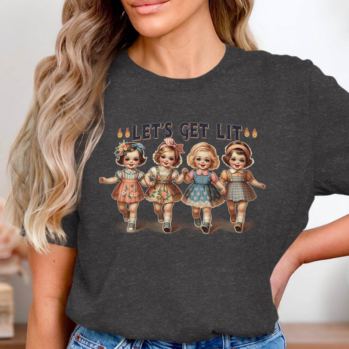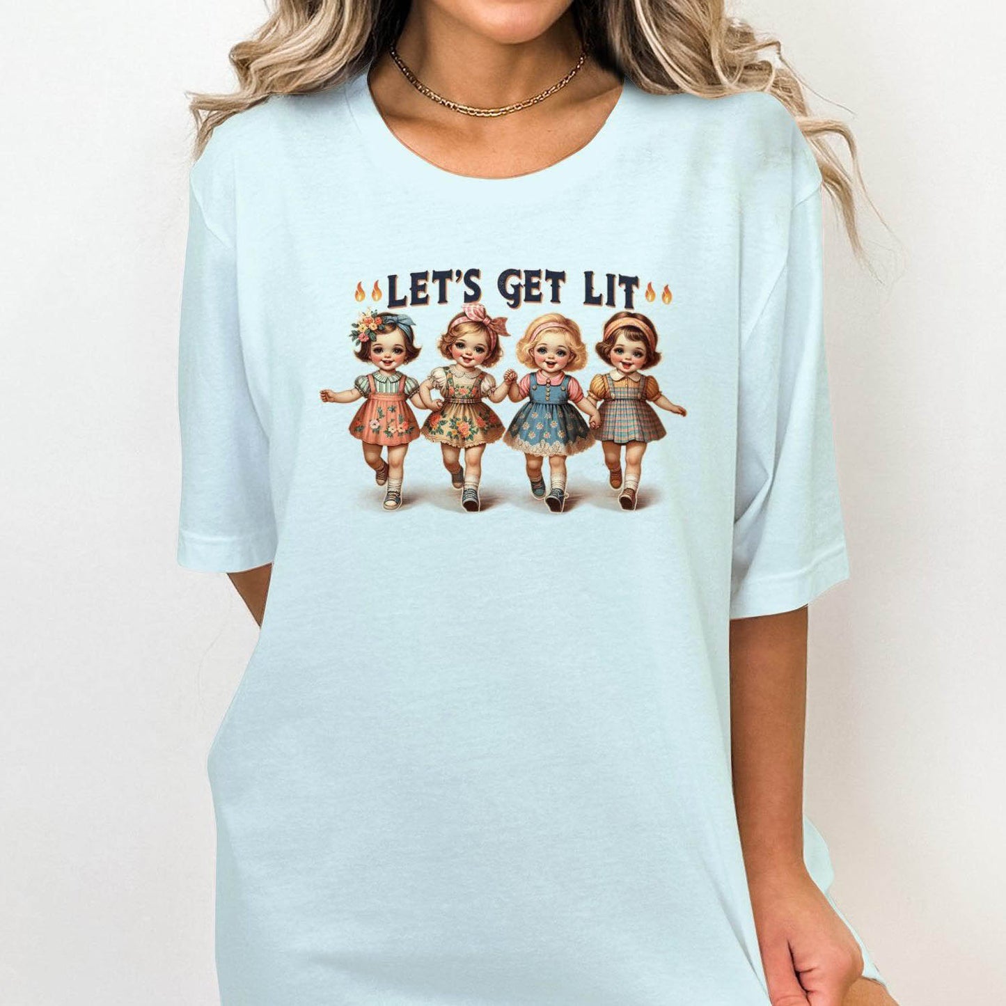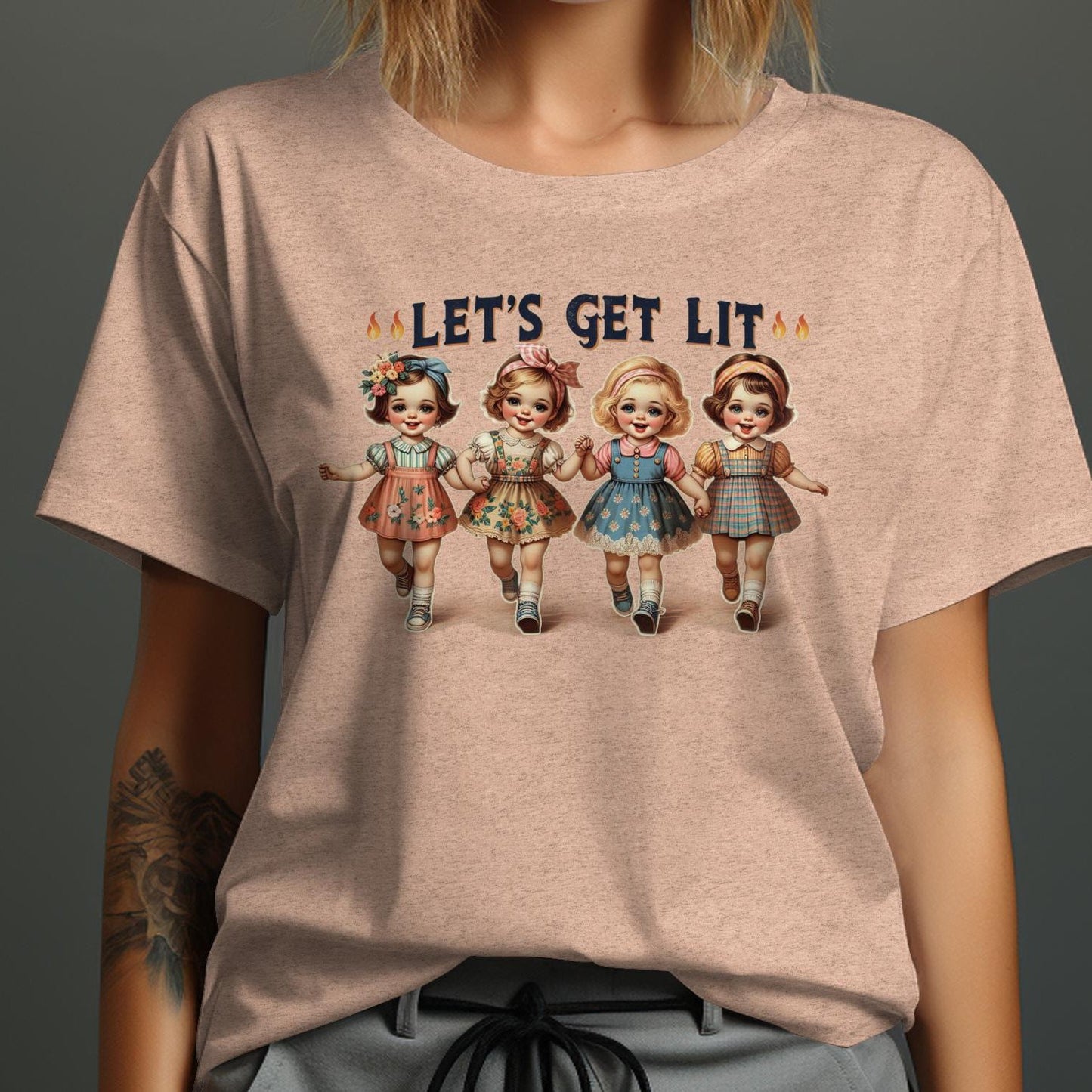 Embrace nostalgia with our Let's Get Lit Retro Vintage Art T-Shirt featuring an adorable graphic of girls in vintage dresses. This charming design brings a touch of whimsy and personality to your wardrobe, making it a delightful choice for casual wear or a statement piece. Perfect for those who love unique and playful fashion, this tee is sure to become a favorite.