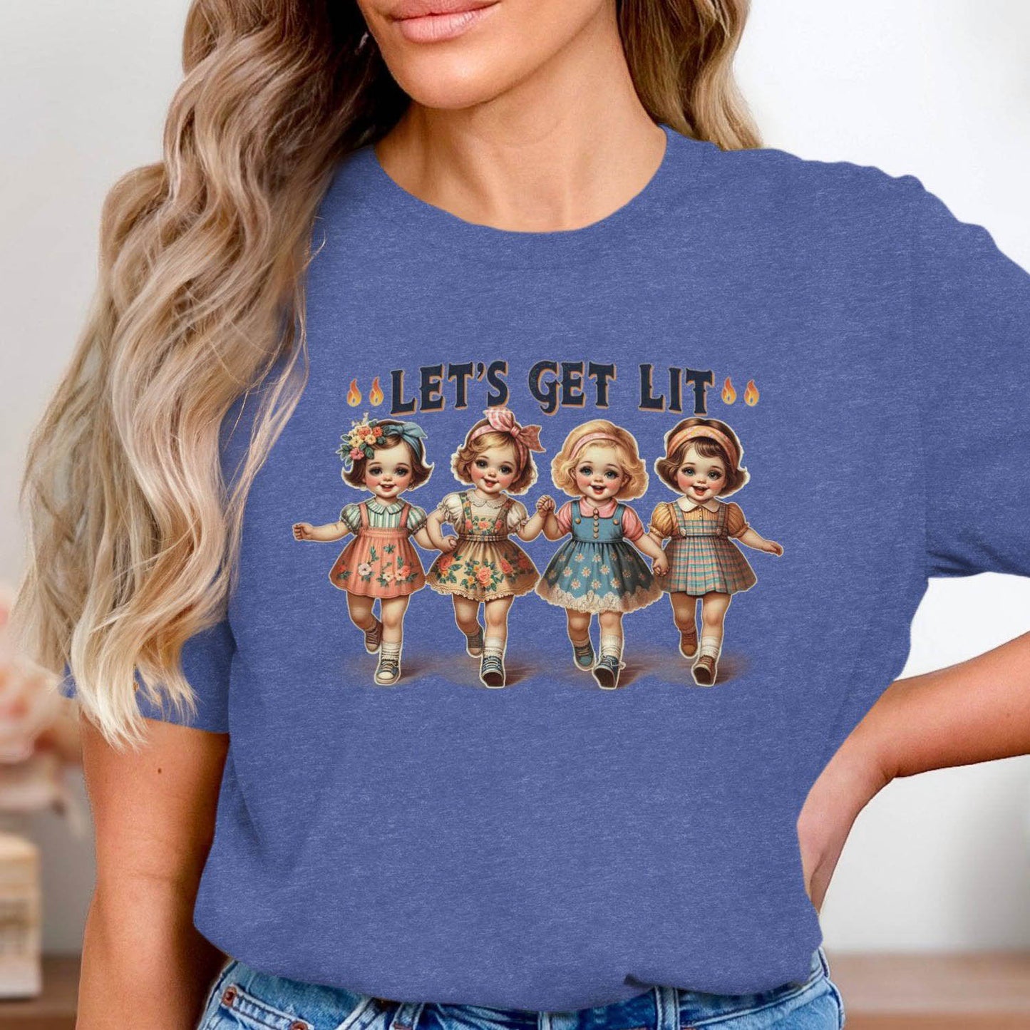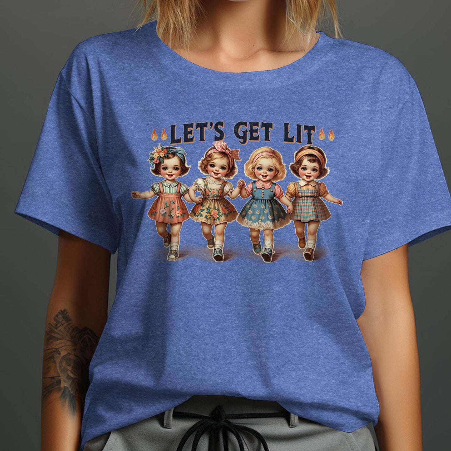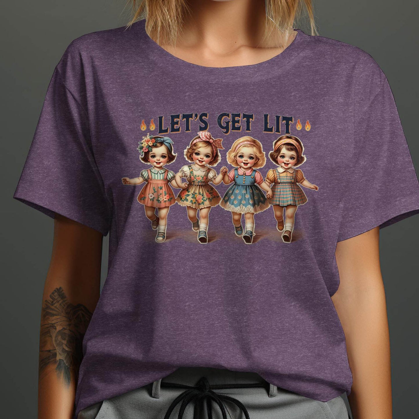 Embrace nostalgia with our Let's Get Lit Retro Vintage Art T-Shirt featuring an adorable graphic of girls in vintage dresses. This charming design brings a touch of whimsy and personality to your wardrobe, making it a delightful choice for casual wear or a statement piece. Perfect for those who love unique and playful fashion, this tee is sure to become a favorite.