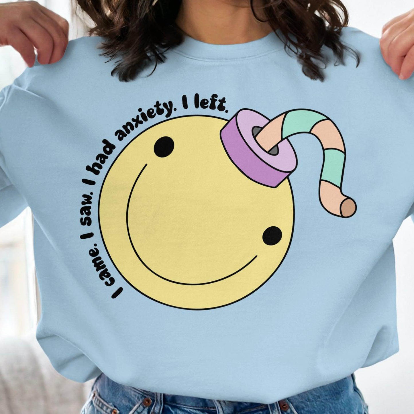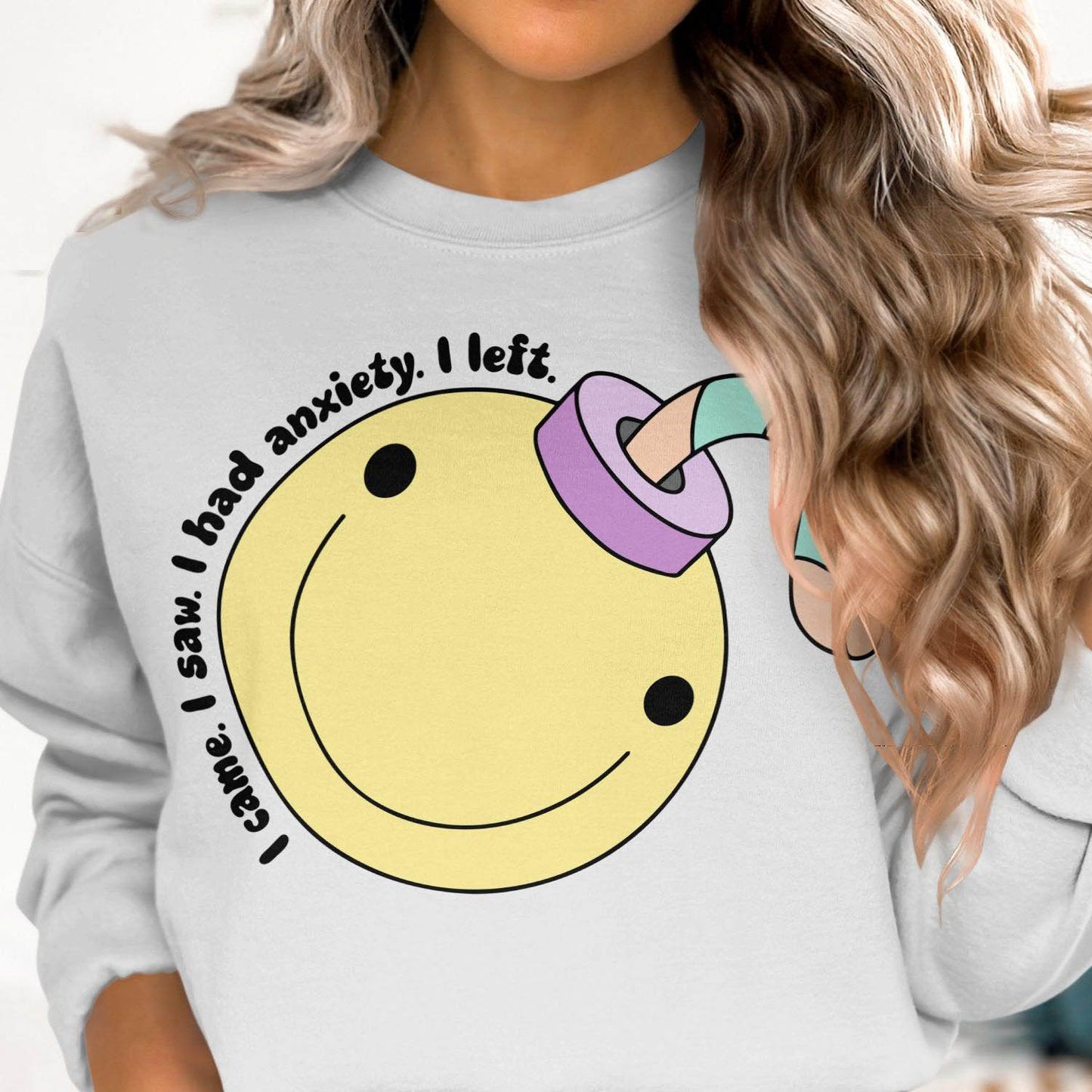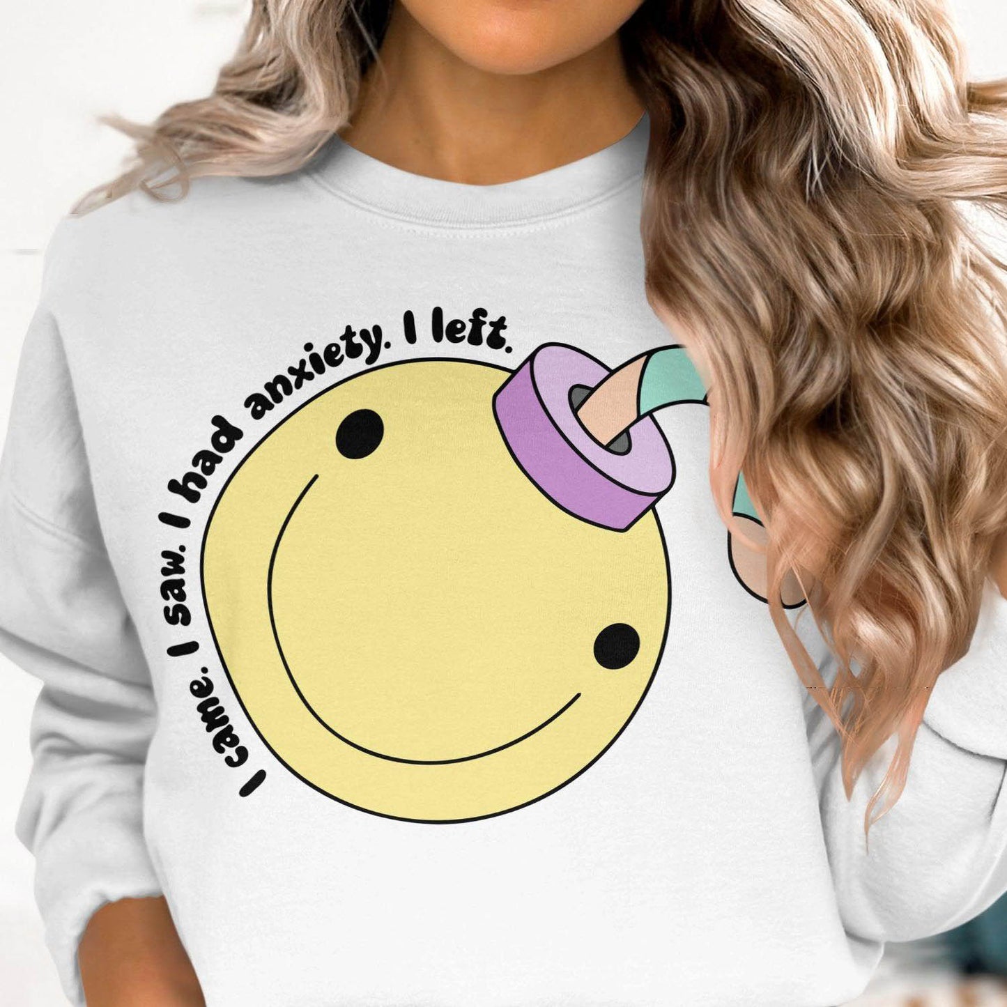 Sweatshirt with Unique Smiley Face Design - I Came, I Saw, I Had Anxiety, I Left Quote