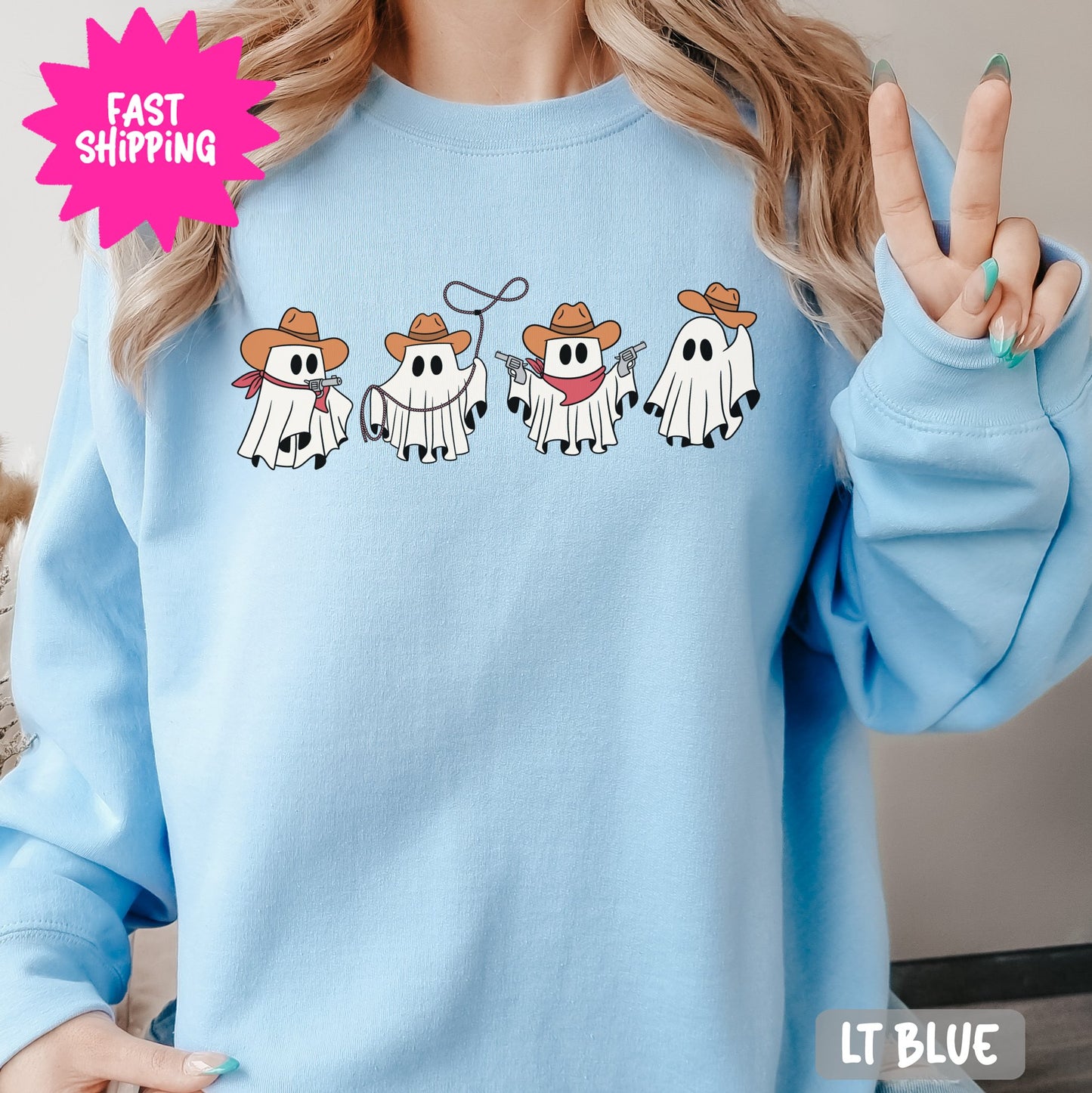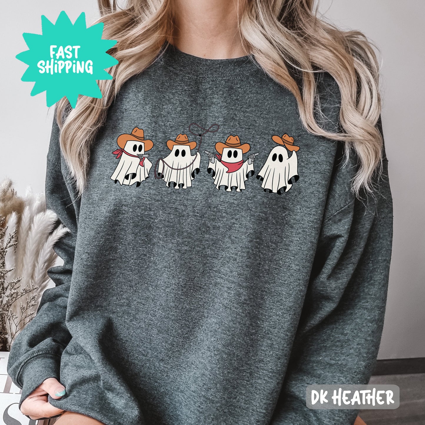Embrace the spooky season with this fun and playful cowboy ghost graphic print on cozy sweatshirts Perfect for a unique and whimsical look