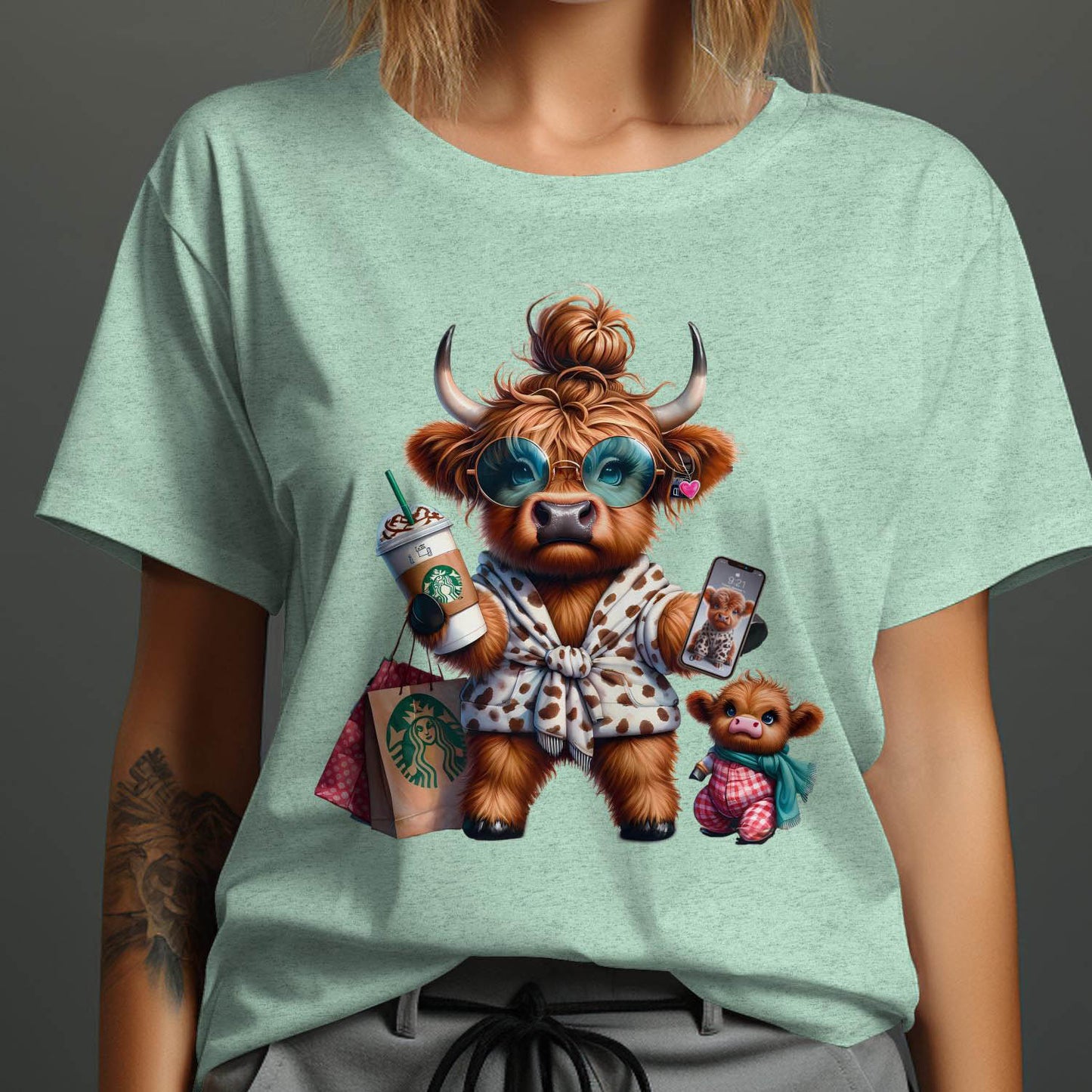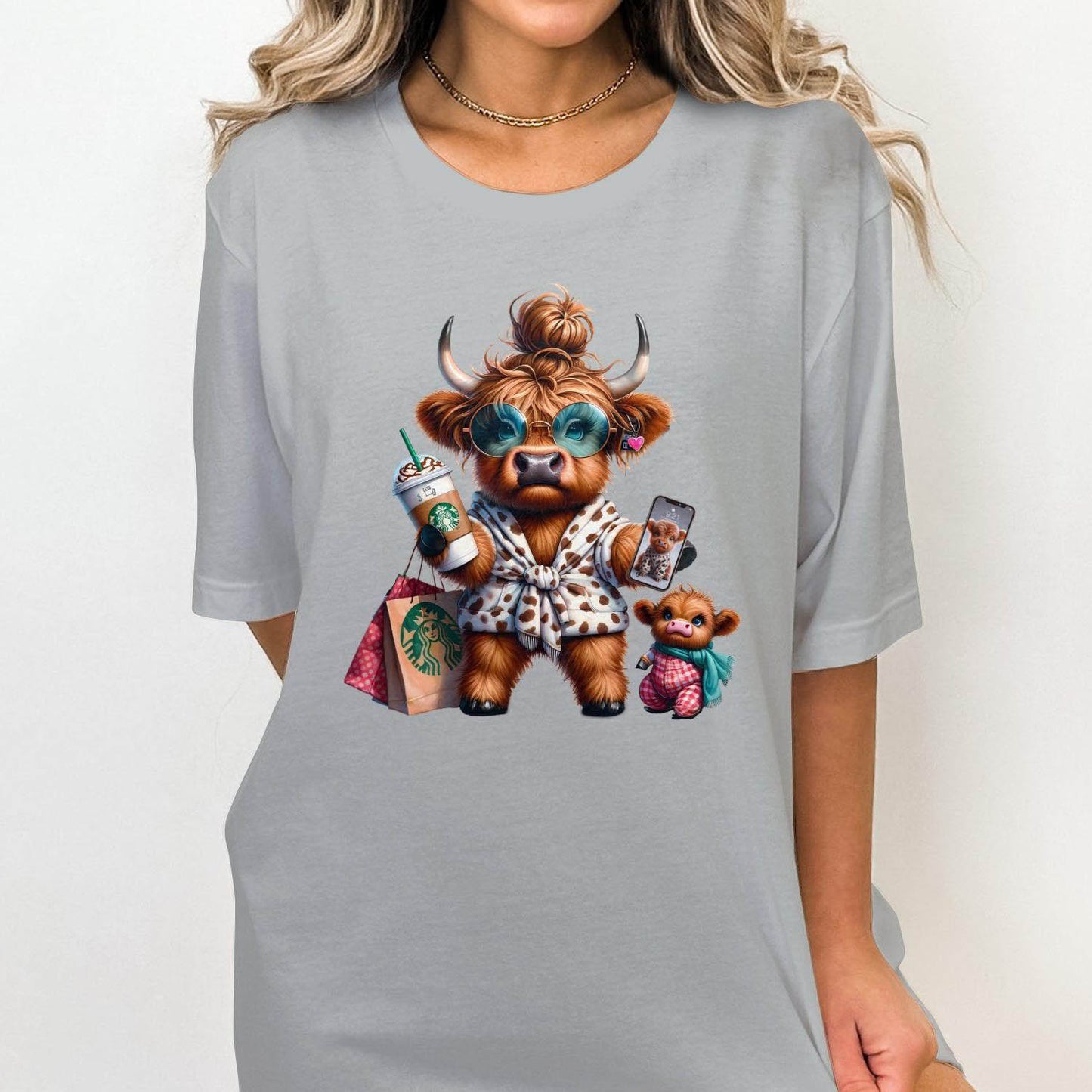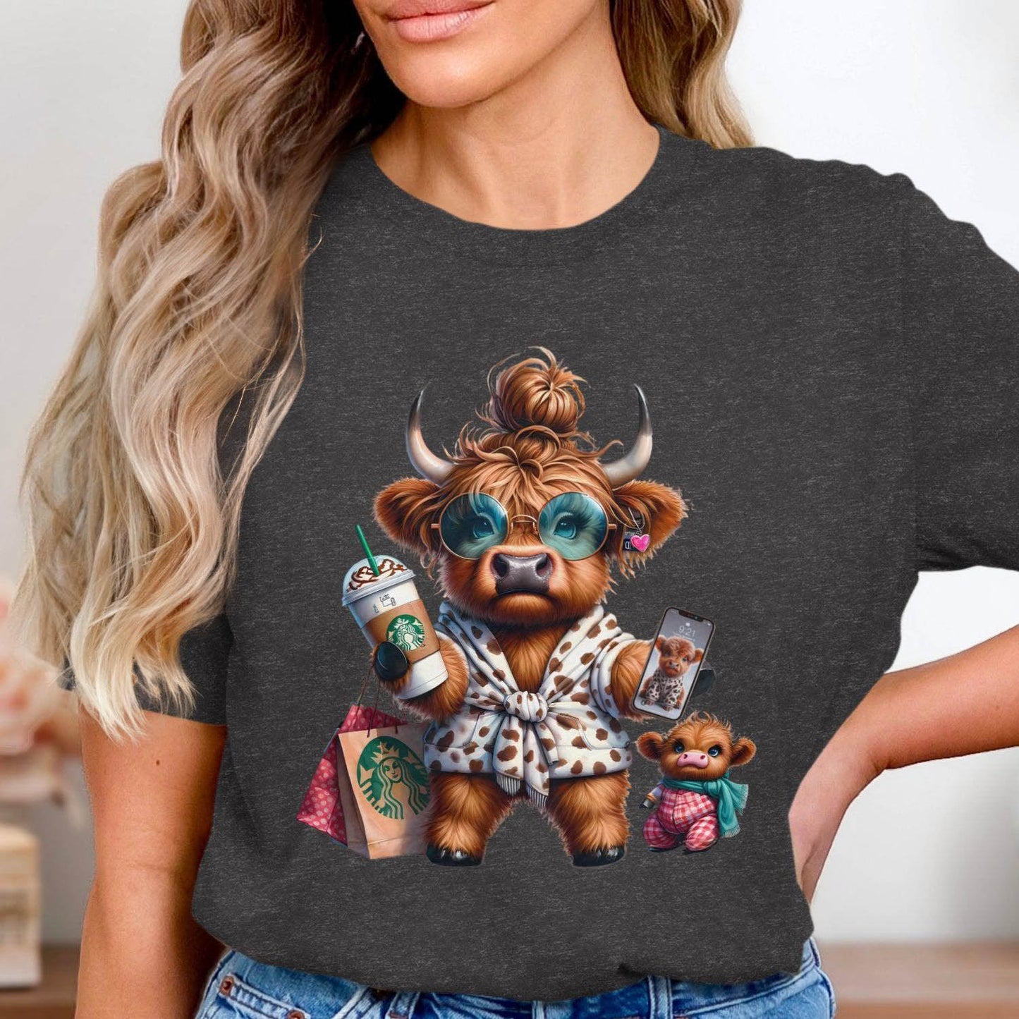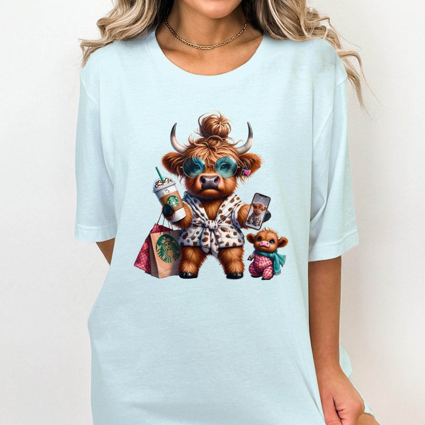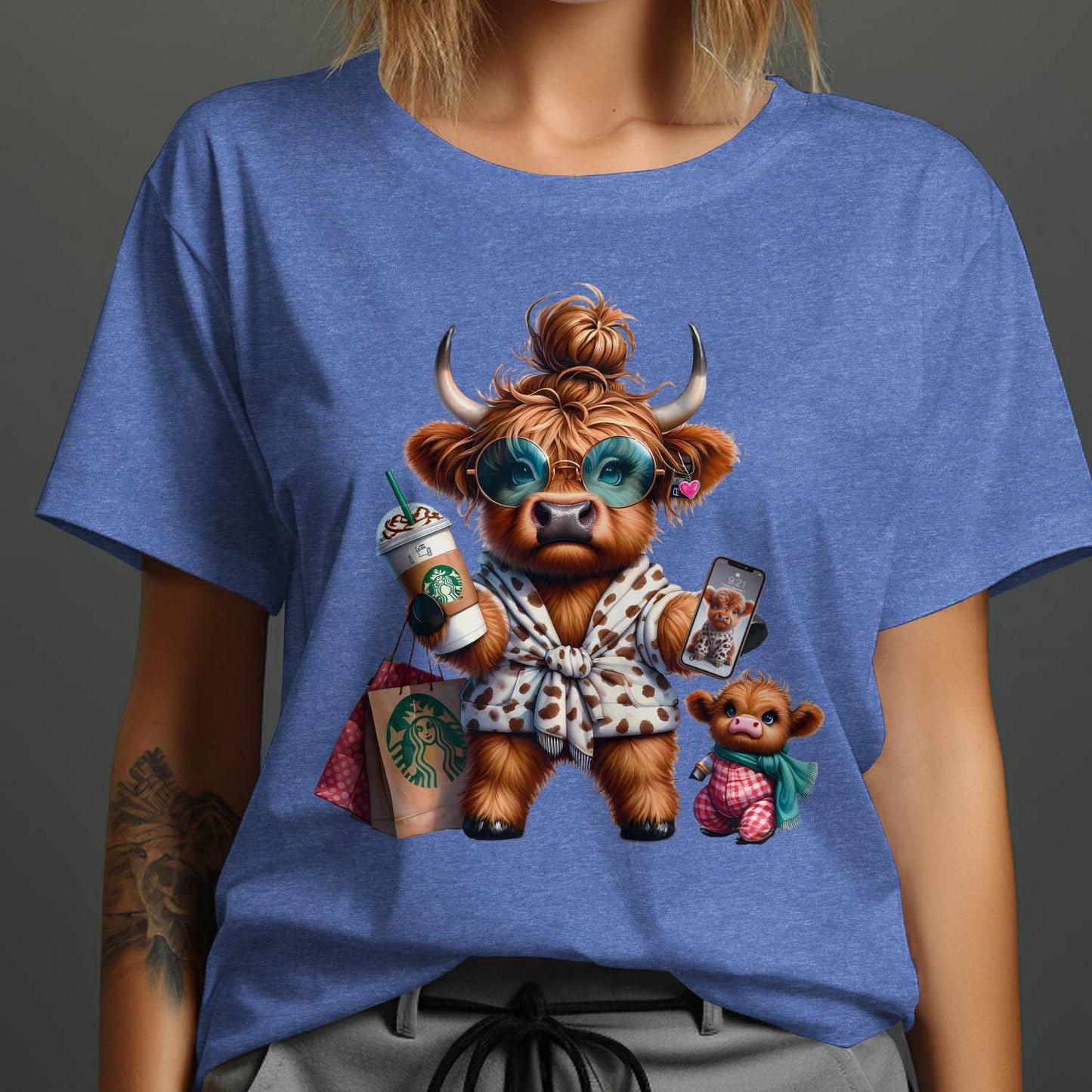 This adorable T-Shirt features a cute Highland cow enjoying a shopping day with a Starbucks drink and her calf. Perfect for animal lovers and those who enjoy unique and humorous designs. This unique design adds a touch of whimsy and joy to your wardrobe. Ideal gift for moms and cow enthusiasts.
