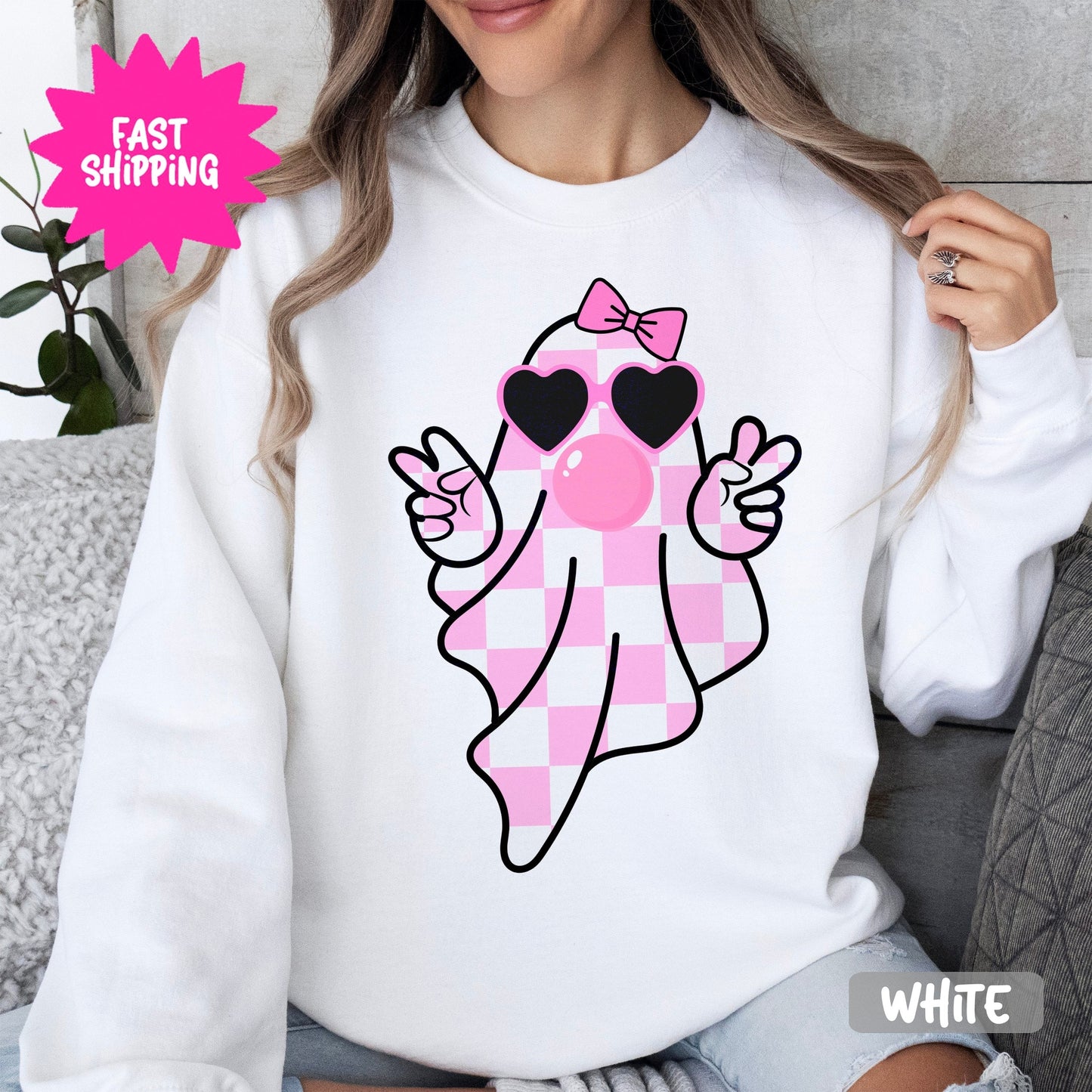 Adorable pink ghost sweatshirts with heart shaped sunglasses and a bow perfect for playful and unique fashion statement wearers.