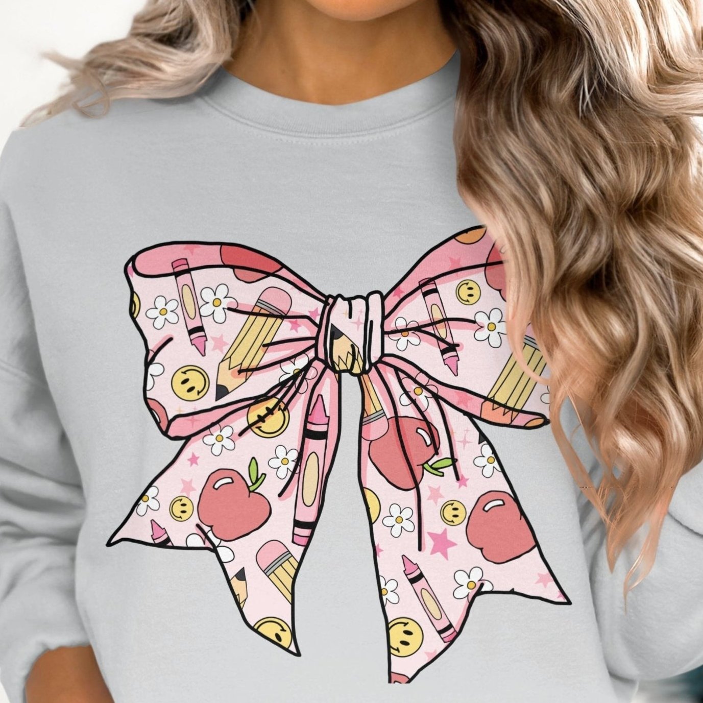 Cute School Supplies Bow Sweatshirt, Back to School Design, Teacher Appreciation Gift, Fun Classroom Sweatshirt