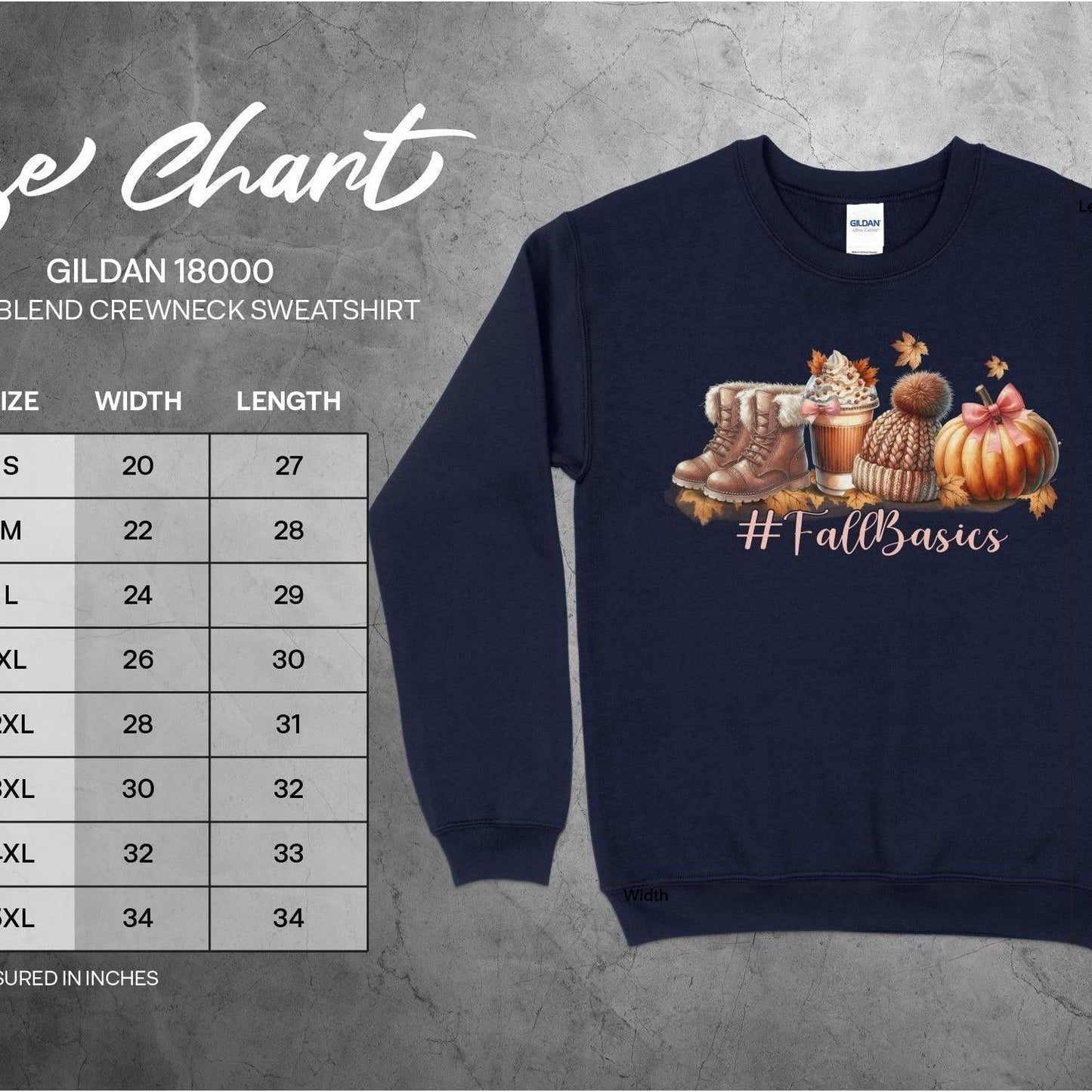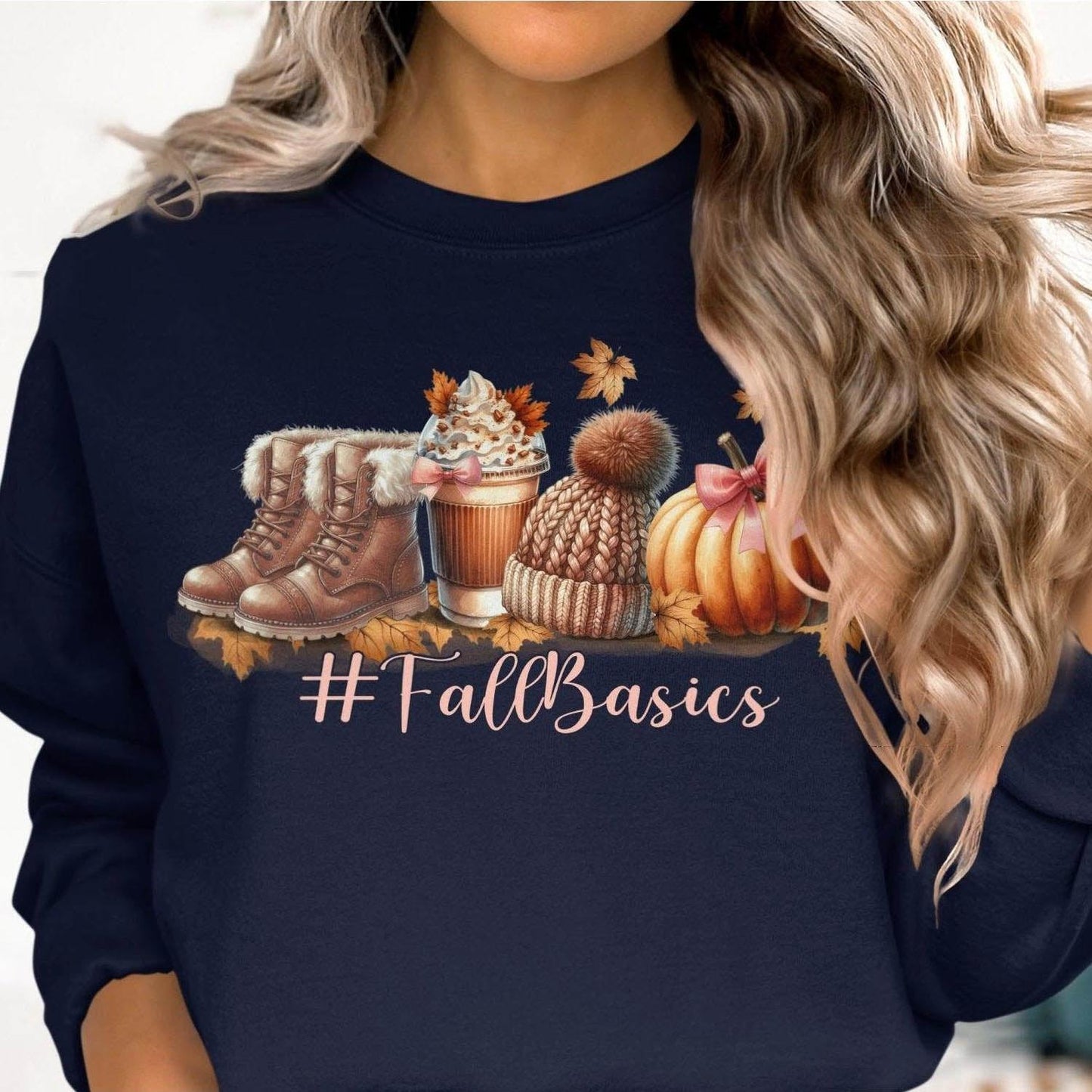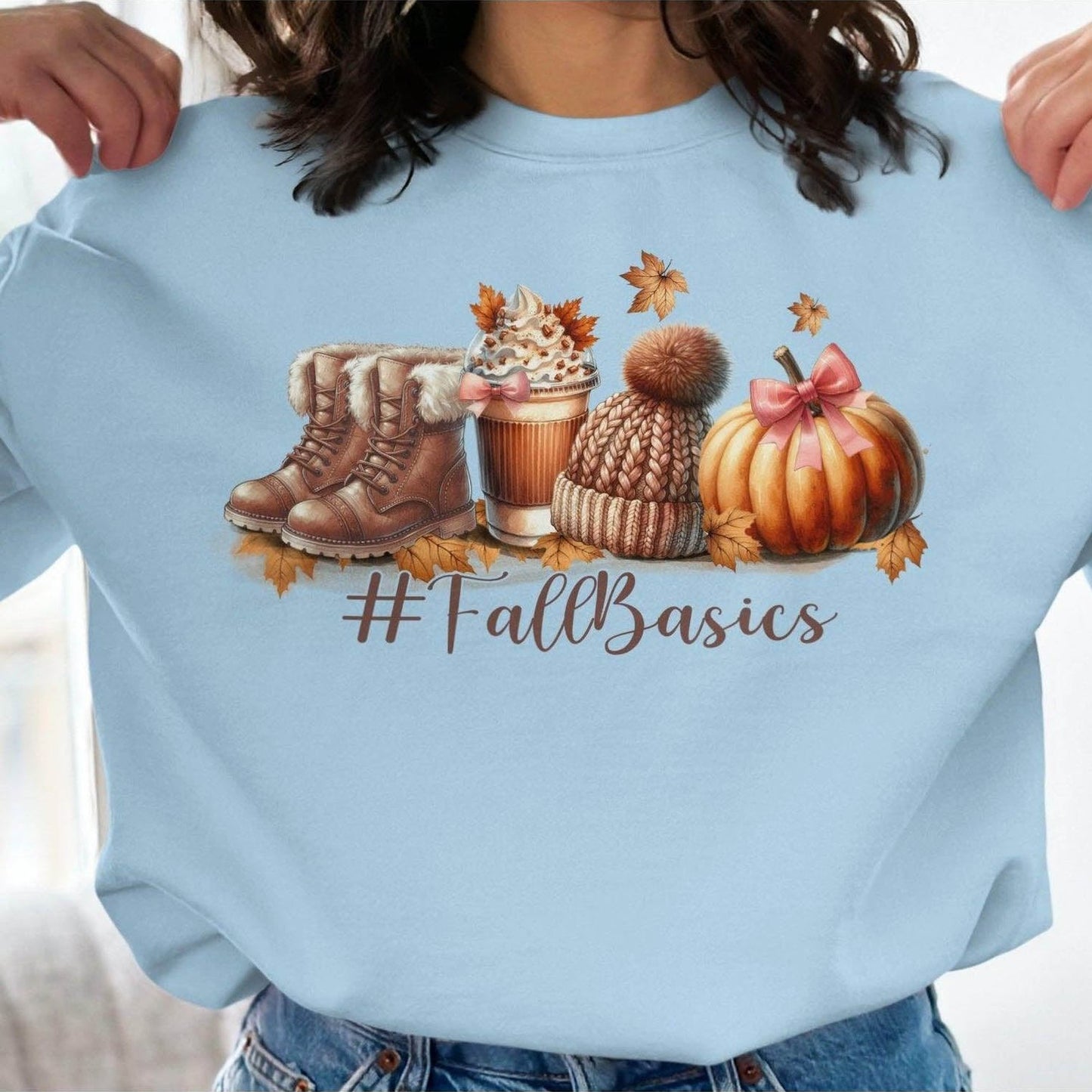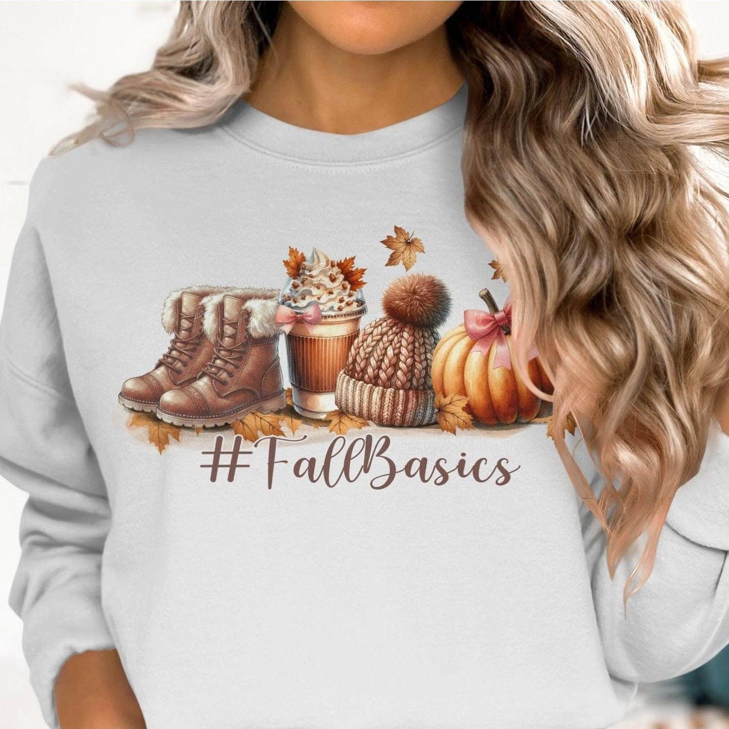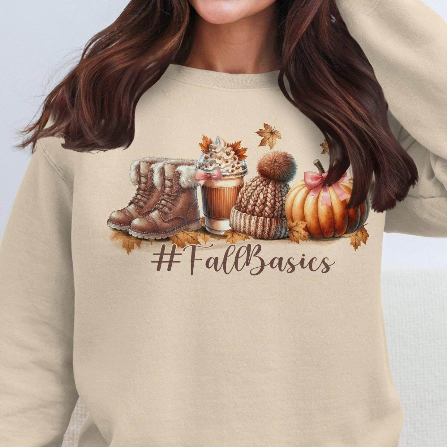 Fall Basics Sweatshirt with Cute Autumn Boot, Pumpkin, Hat, and Cup Design