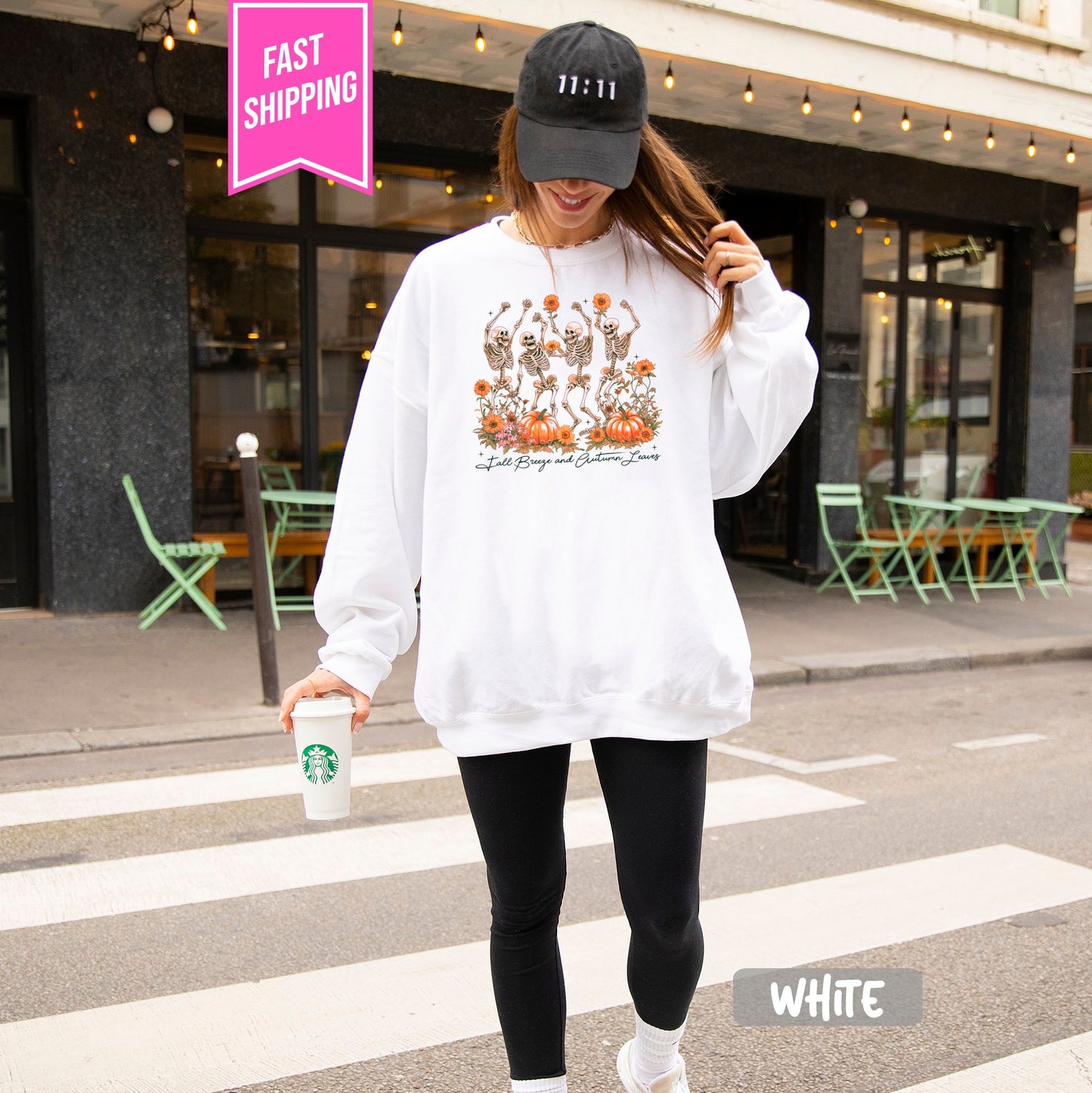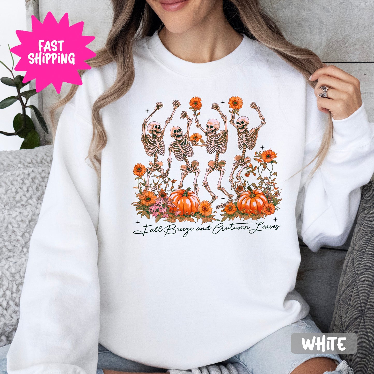 Fall Breeze Autumn Leaves Skeleton Dancing Crewneck, Skeleton Fall Pumpkins and Flowers Sweatshirt, Halloween Sweatshirt