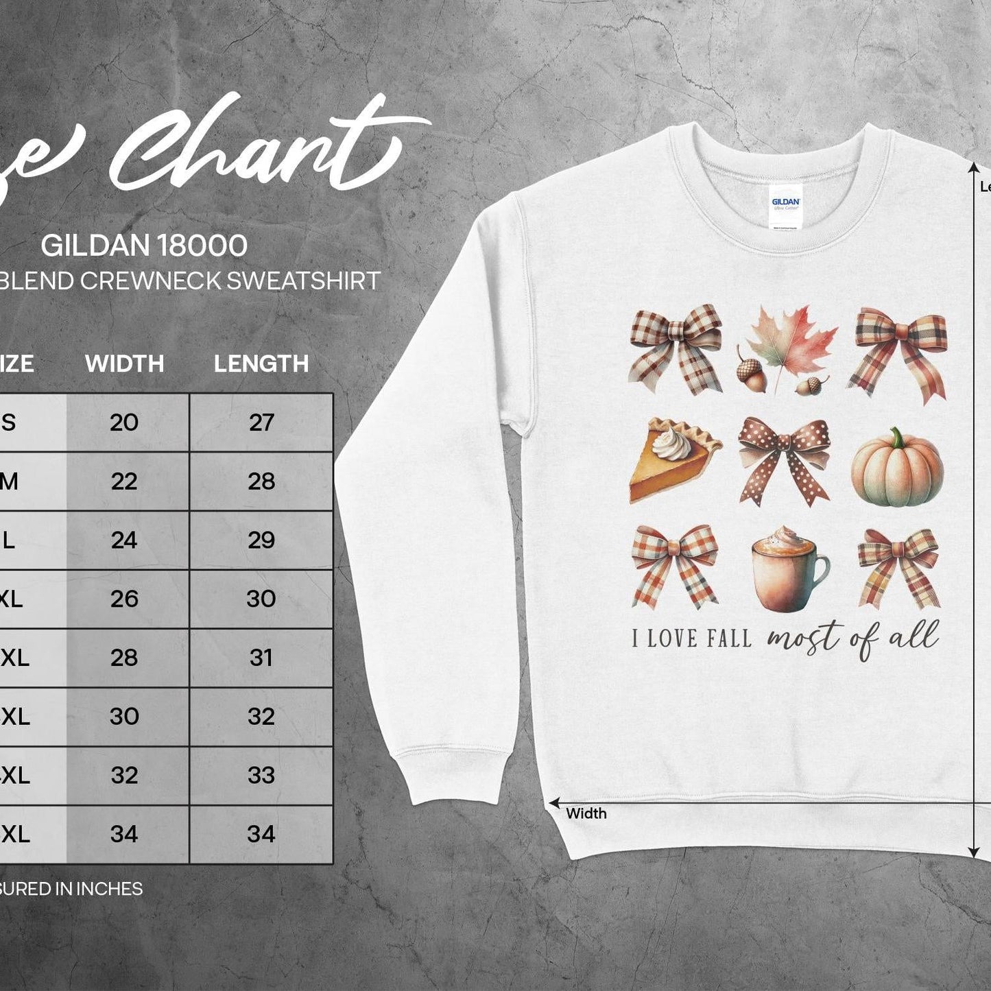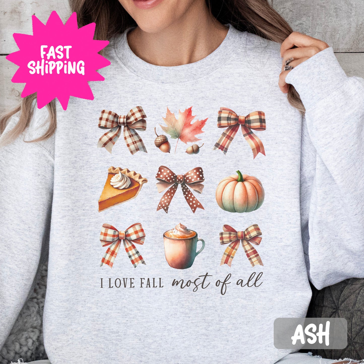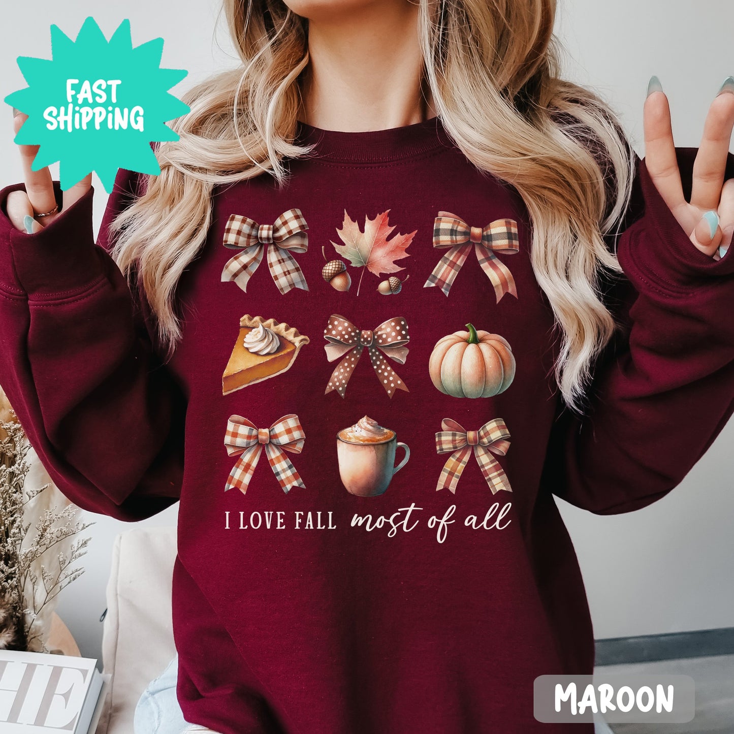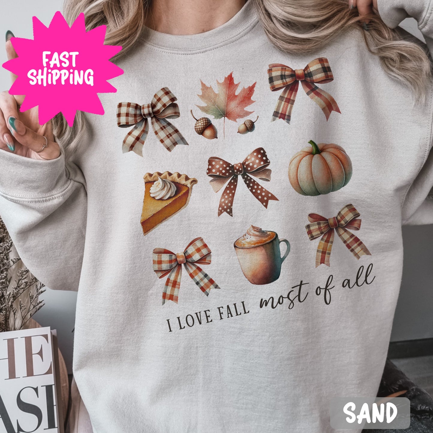 Fall Sweatshirt, I Love Fall Most of All, Autumn Crewneck, Cozy Pumpkin Spice, Cute Bows, Fall Leaves and Pumpkin Pie