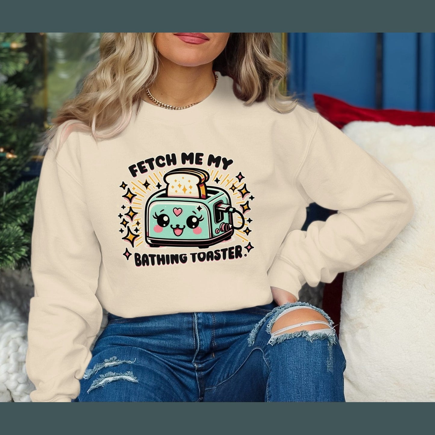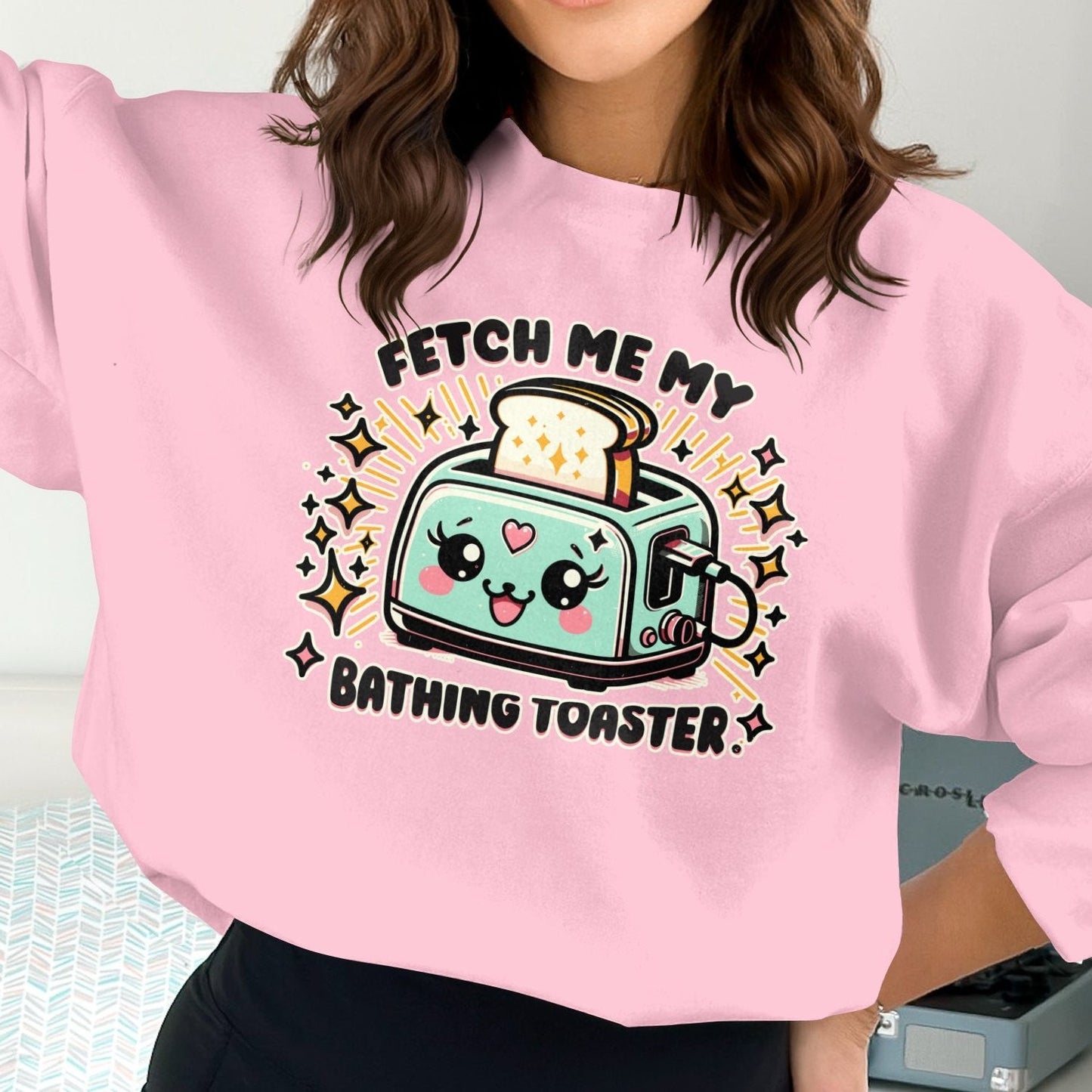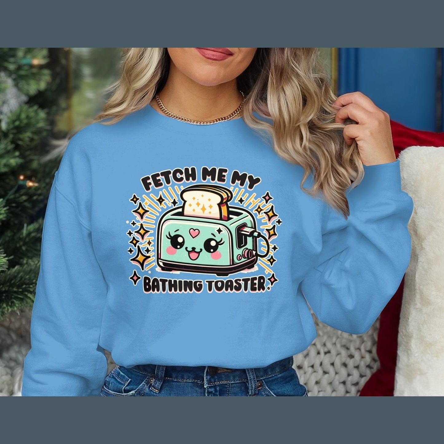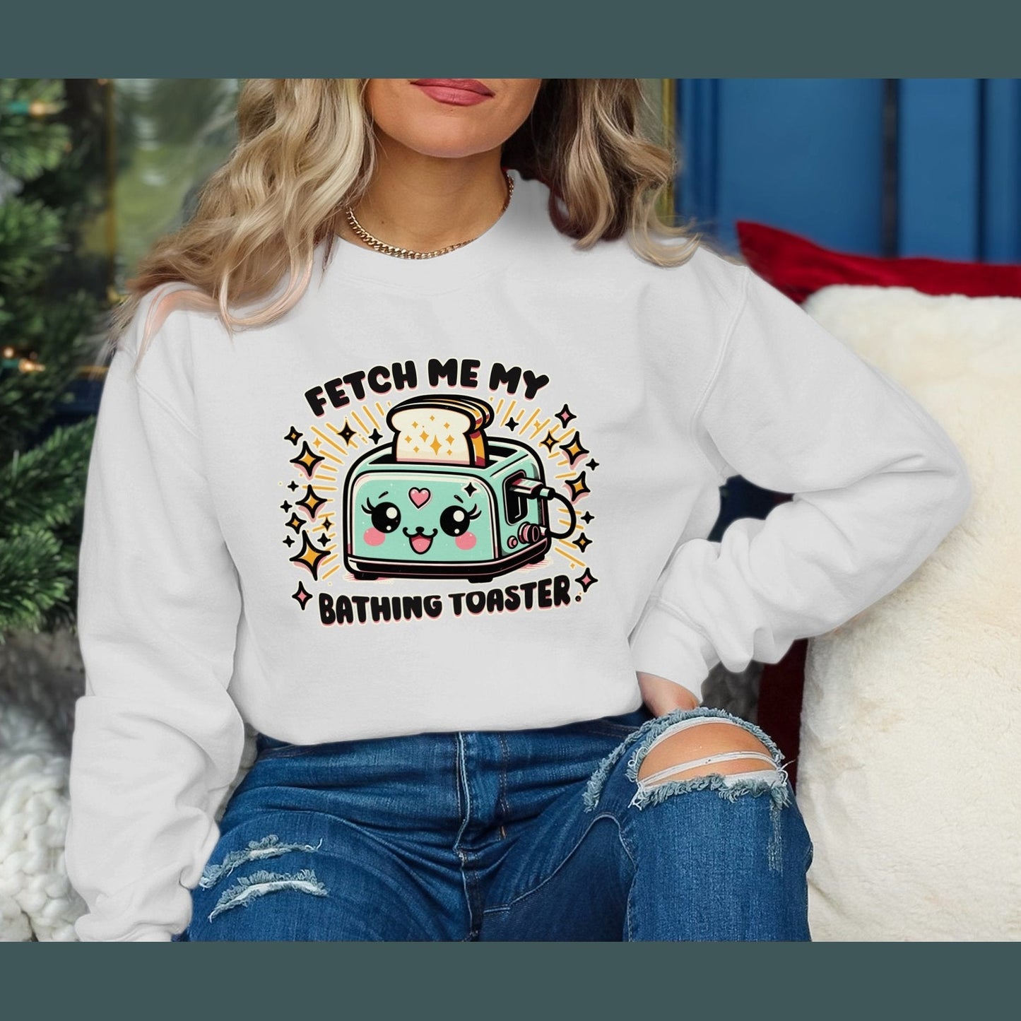 Show off your humorous side with this hilarious Fetch Me My Bathing Toaster crewneck pullover. Perfect for adding a fun flair to your casual outfits.