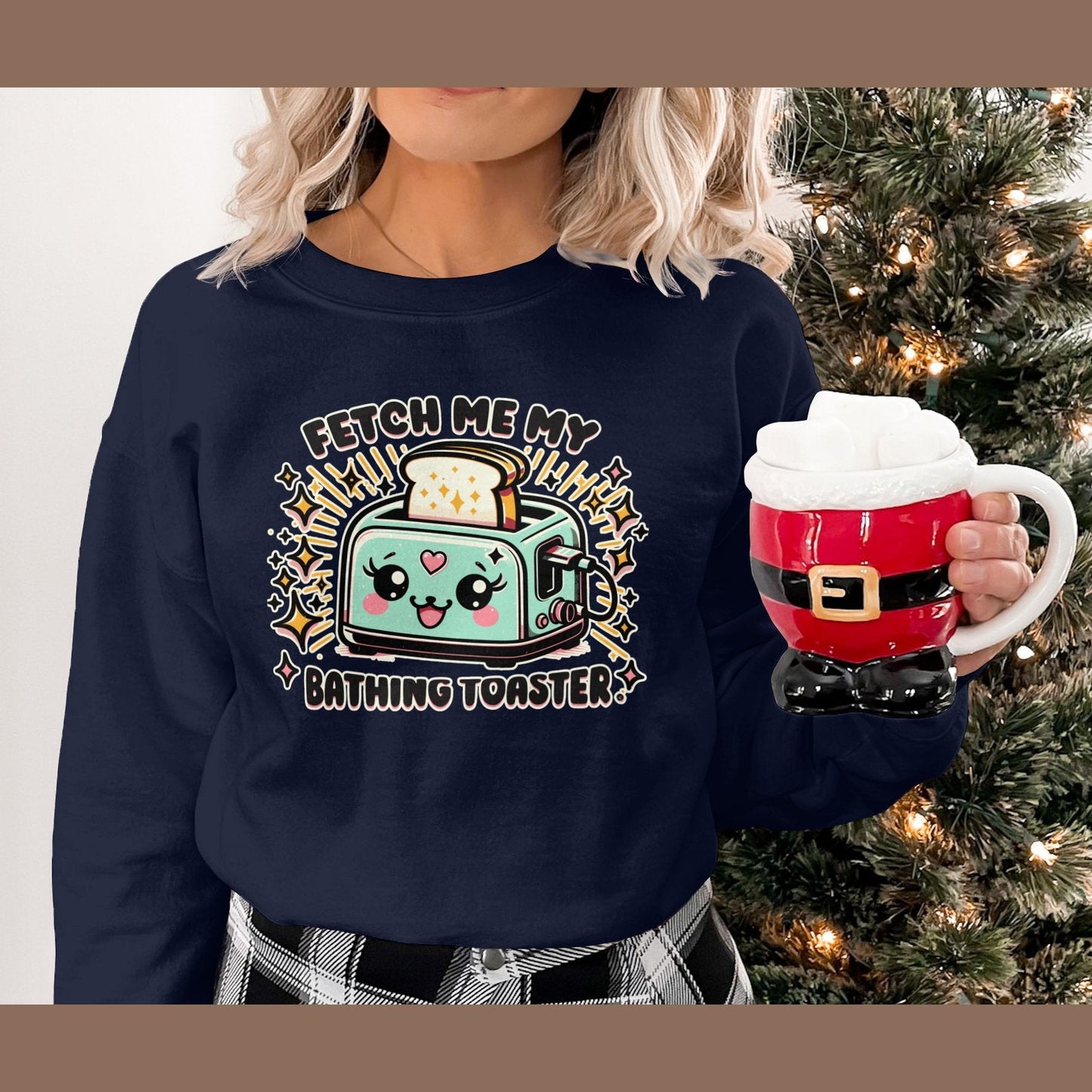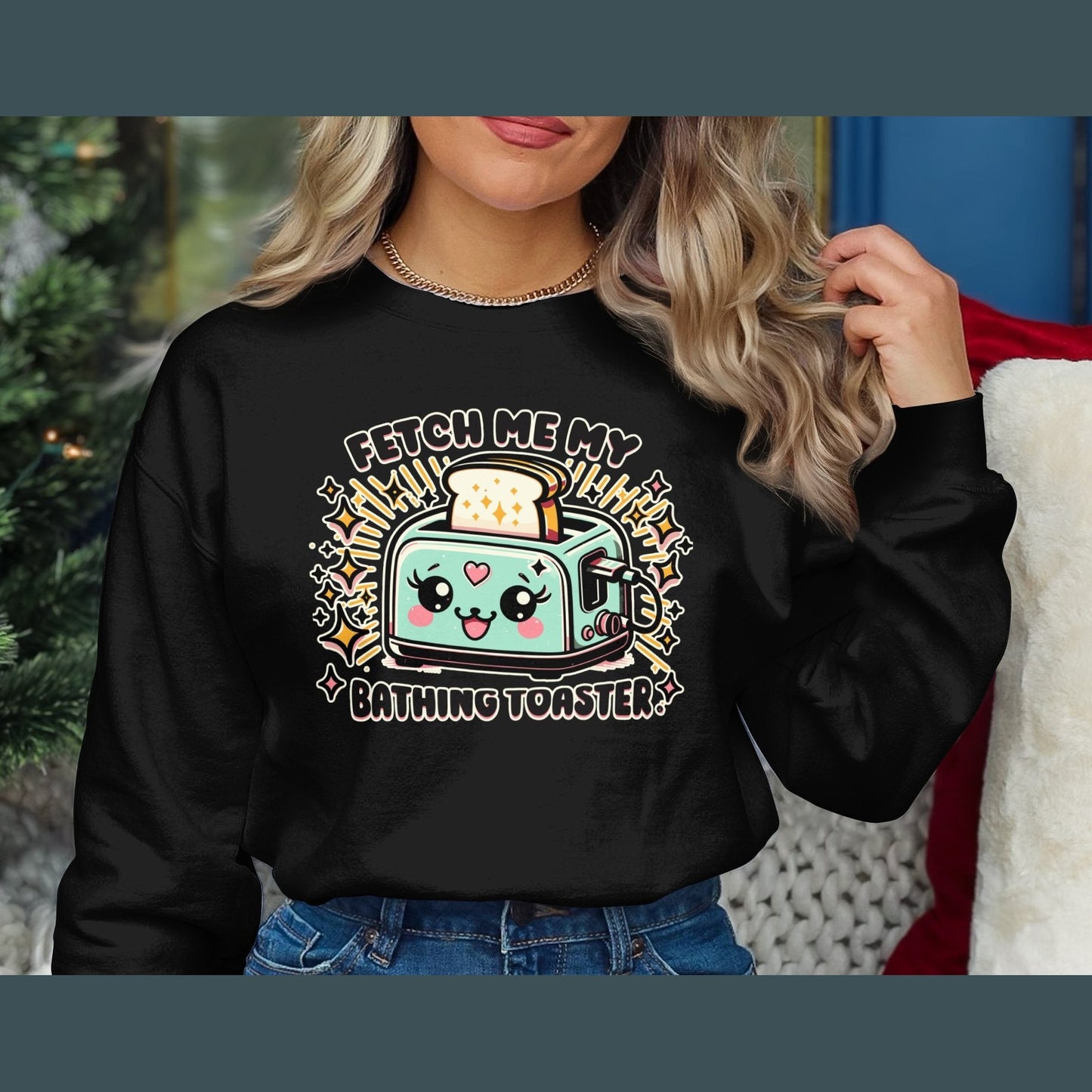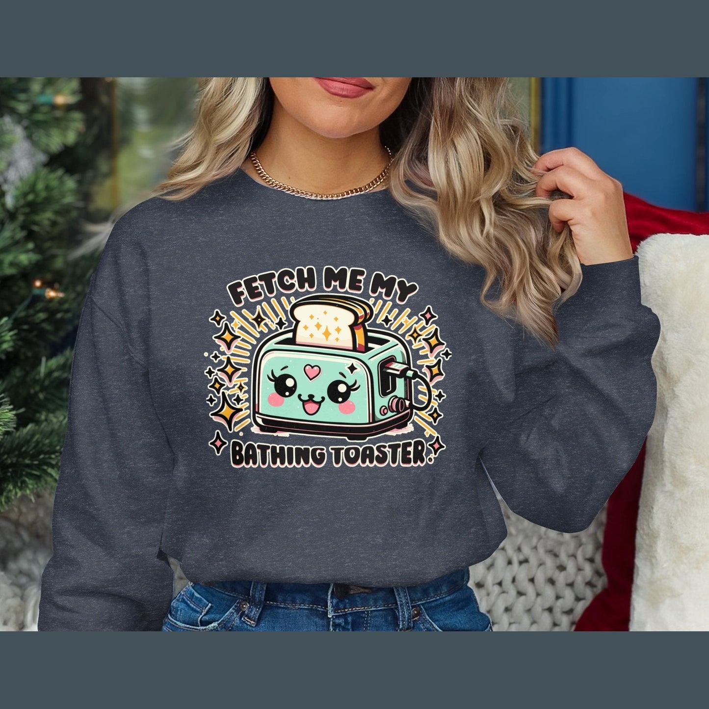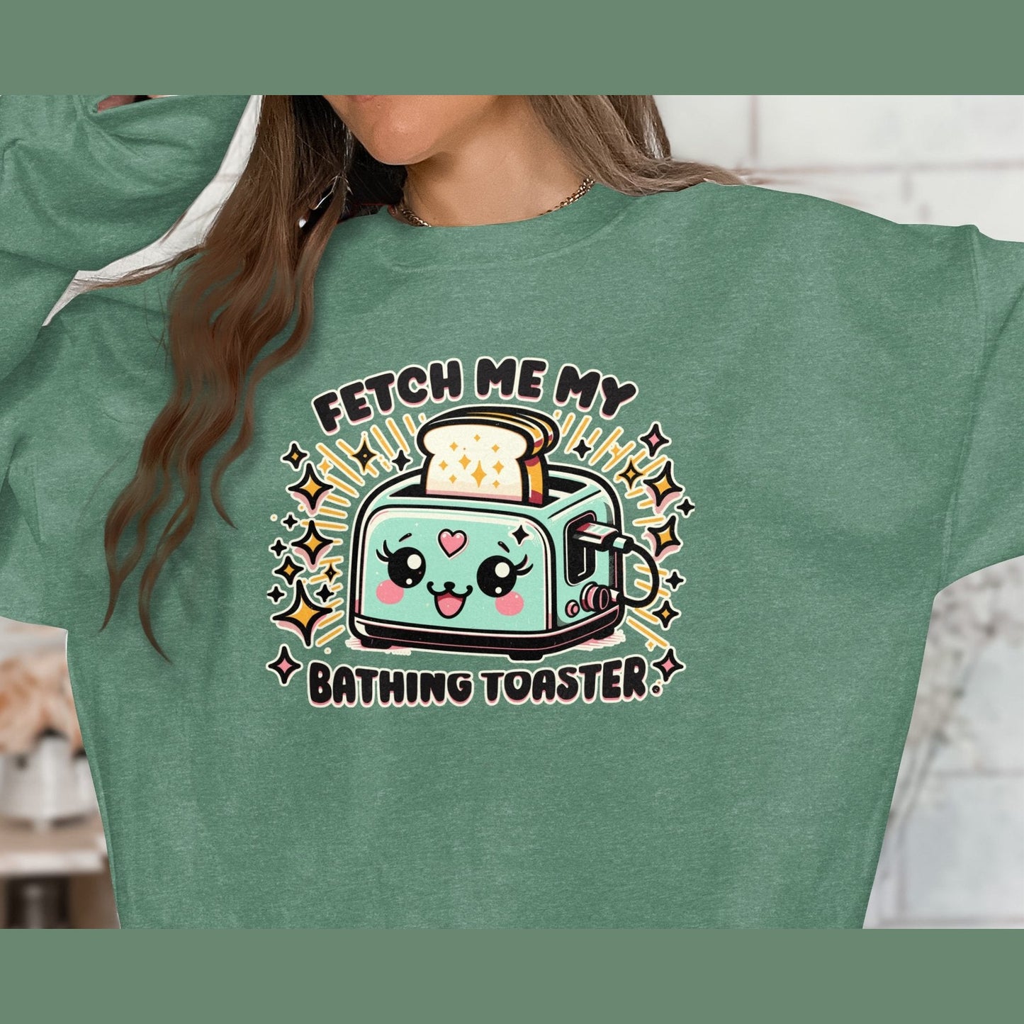 Show off your humorous side with this hilarious Fetch Me My Bathing Toaster crewneck pullover. Perfect for adding a fun flair to your casual outfits.