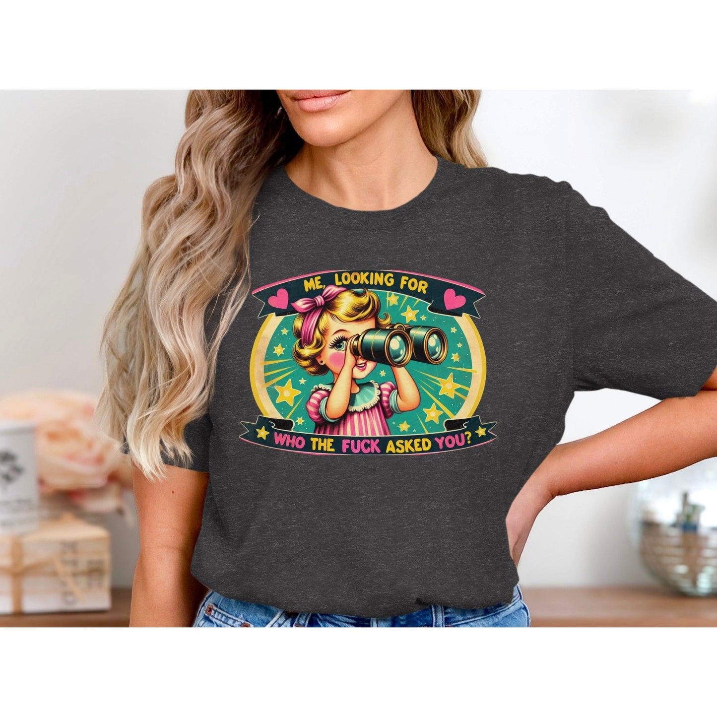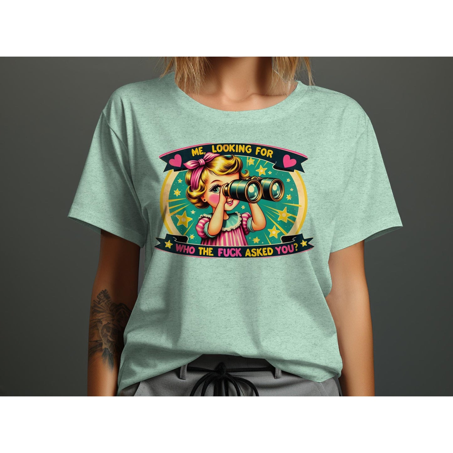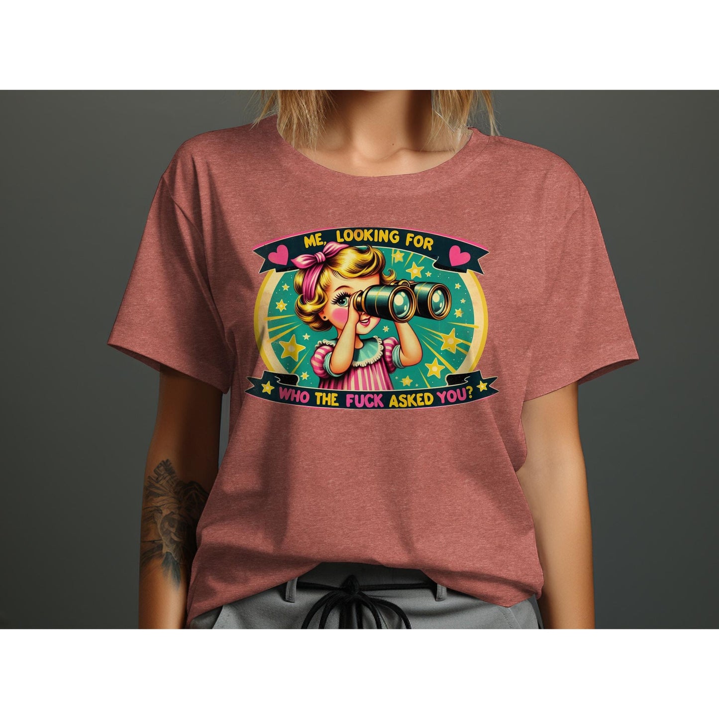 This Funny Vintage Girl T-Shirt is perfect for making a bold statement. Featuring a humorous graphic of a girl with binoculars and the phrase "Who the heck asked you?" this retro-inspired tee adds a touch of sarcasm to any outfit. It's a great conversation starter and a unique gift for friends who appreciate a good laugh. Wear it casually for a fun-filled day out.