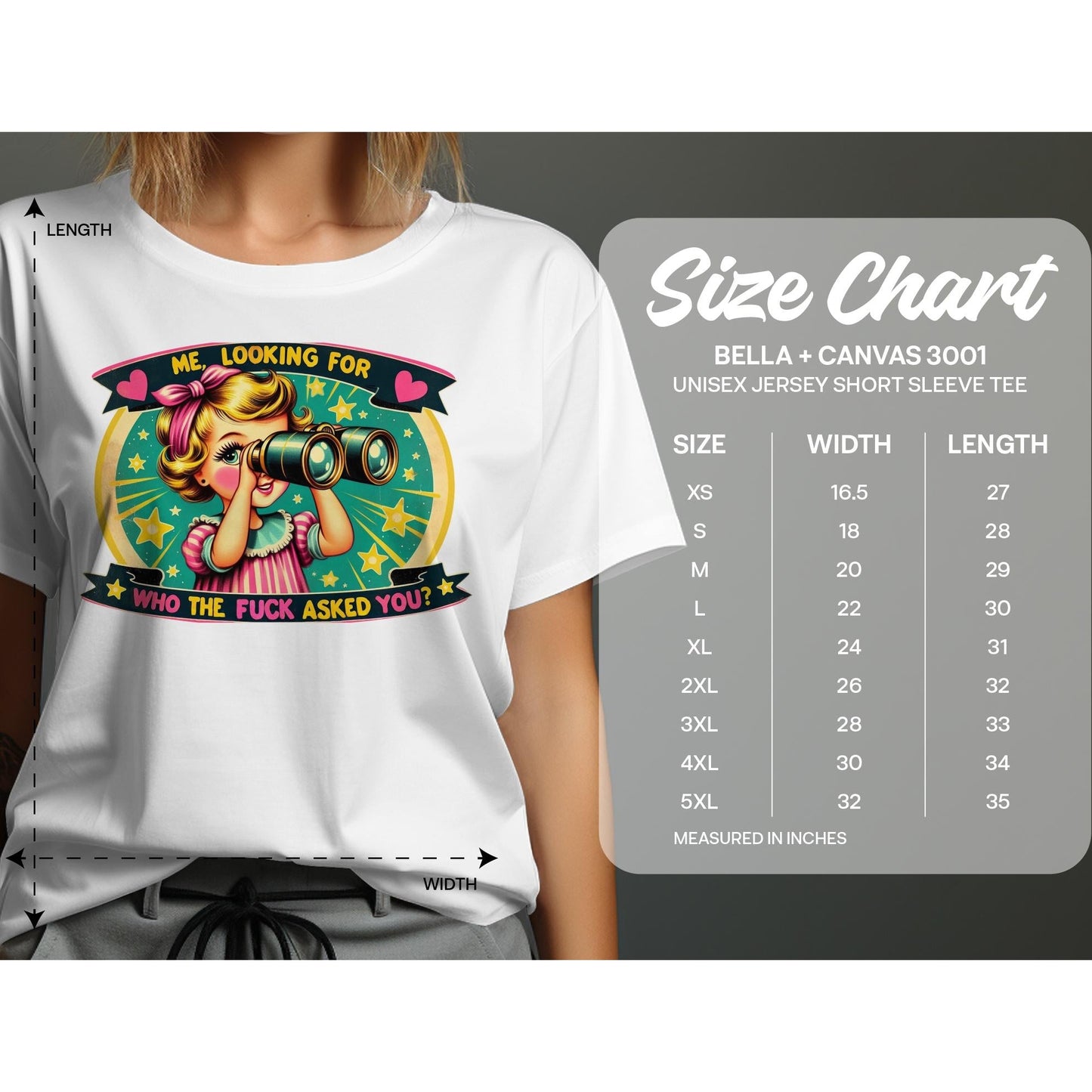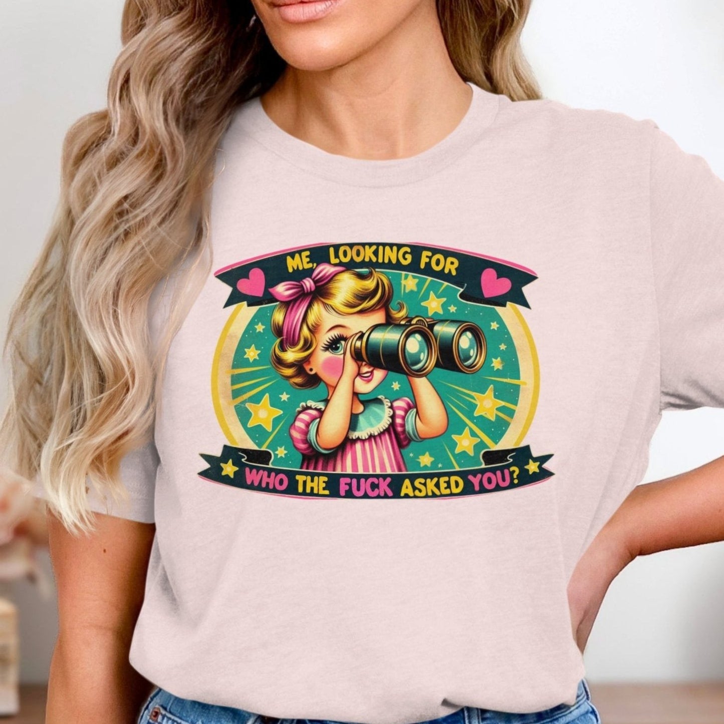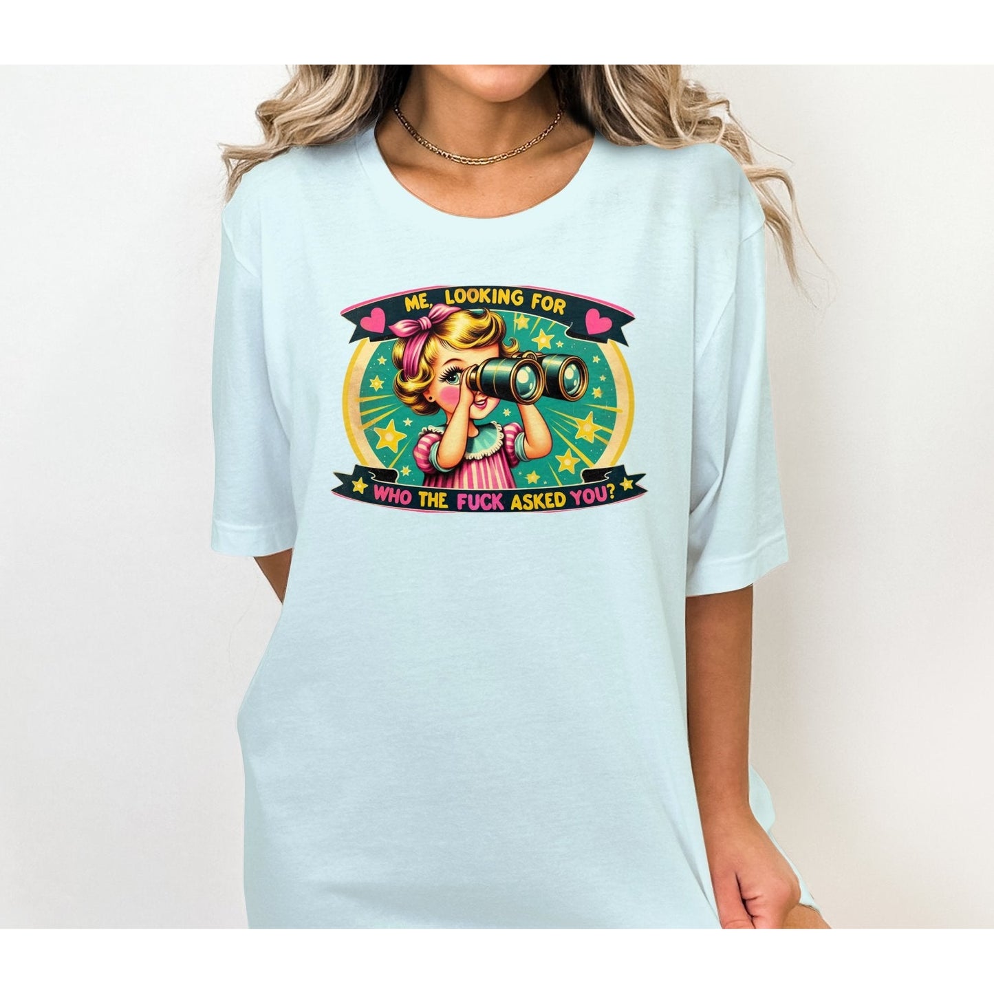 This Funny Vintage Girl T-Shirt is perfect for making a bold statement. Featuring a humorous graphic of a girl with binoculars and the phrase "Who the heck asked you?" this retro-inspired tee adds a touch of sarcasm to any outfit. It's a great conversation starter and a unique gift for friends who appreciate a good laugh. Wear it casually for a fun-filled day out.