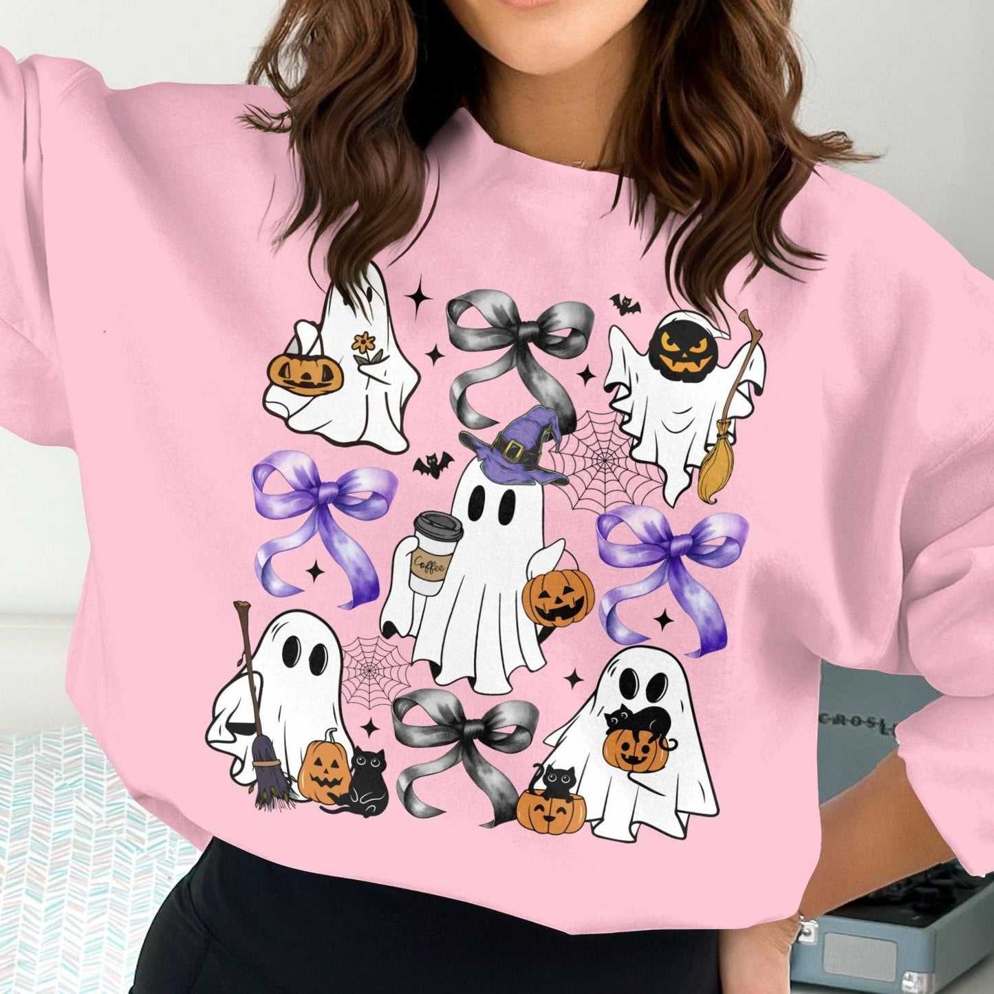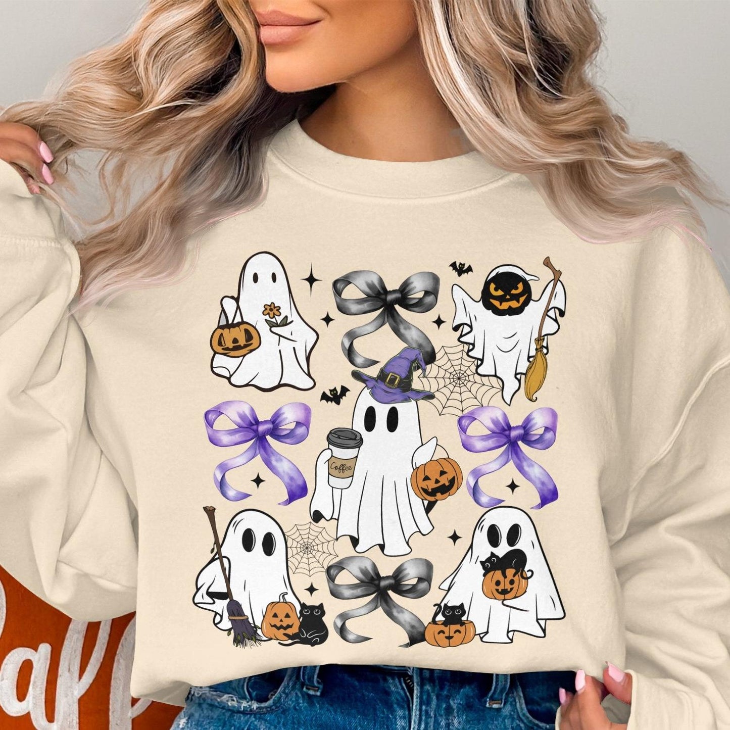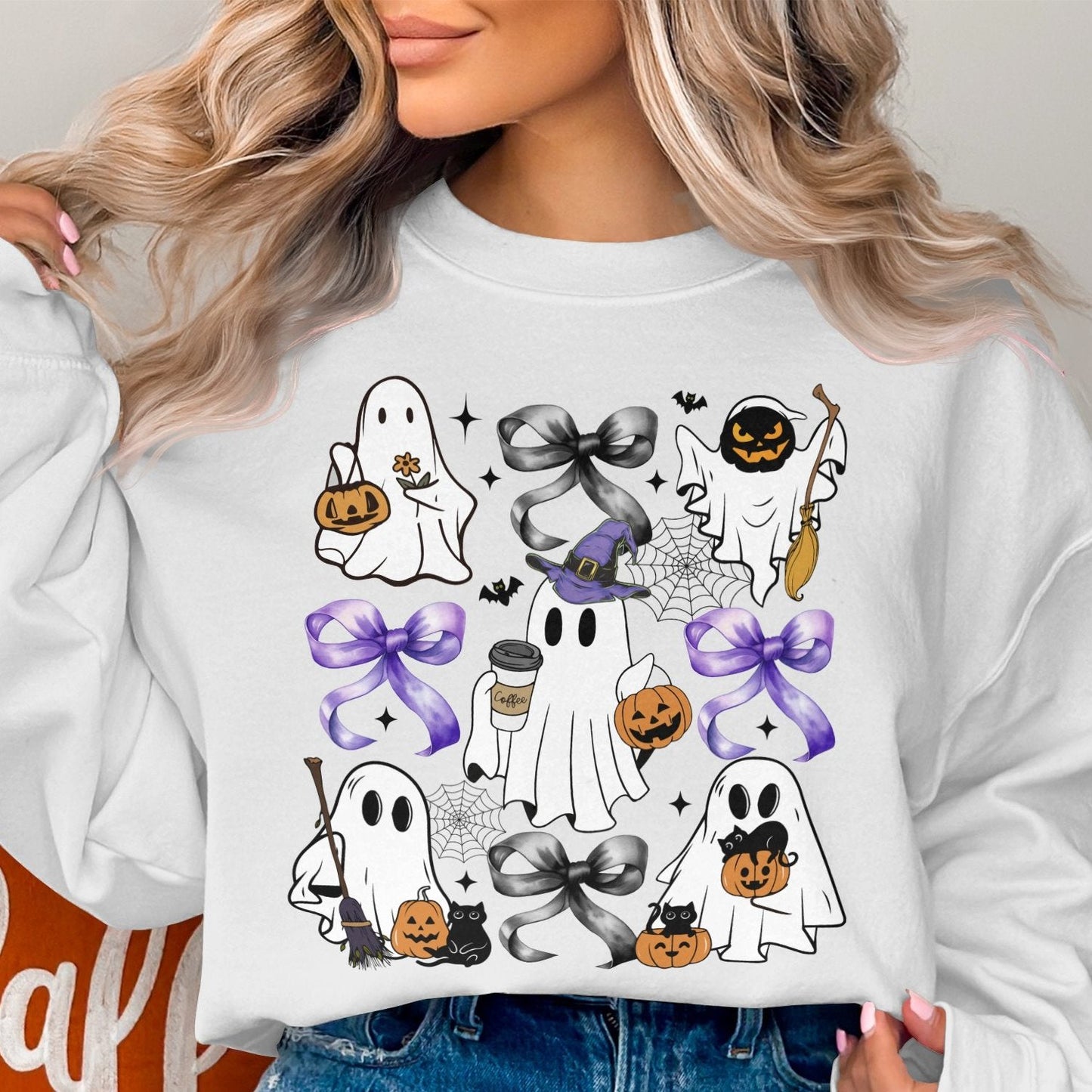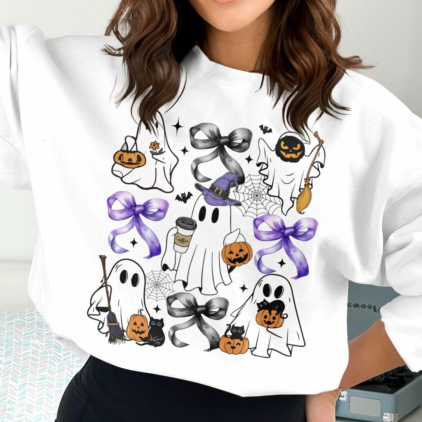 Embrace the Halloween vibes with these Fall sweatshirts featuring cute ghost designs. Perfect for adding a spooky touch to your autumn wardrobe. Stay cozy in style.