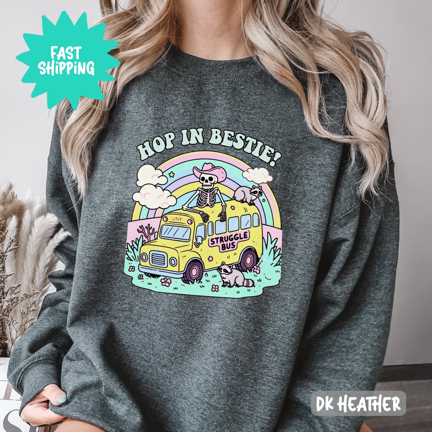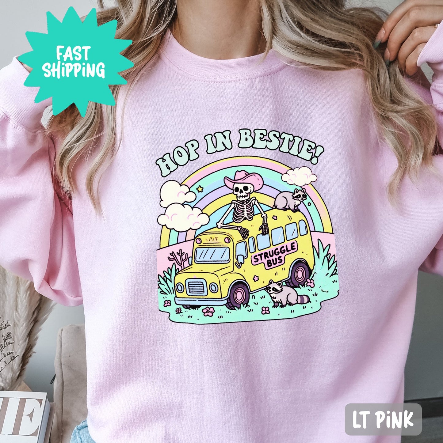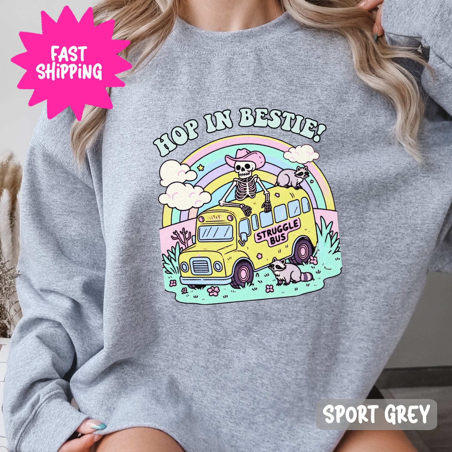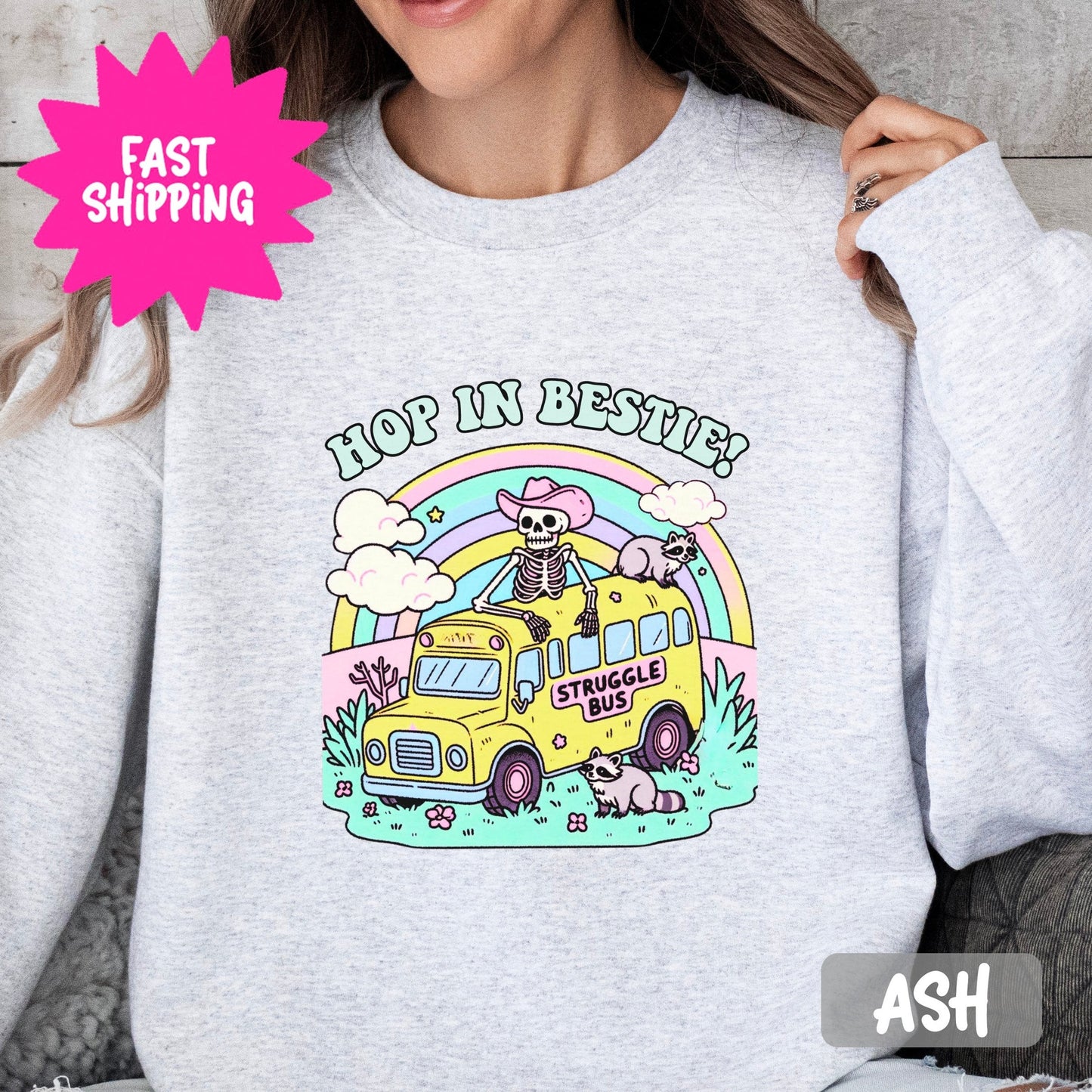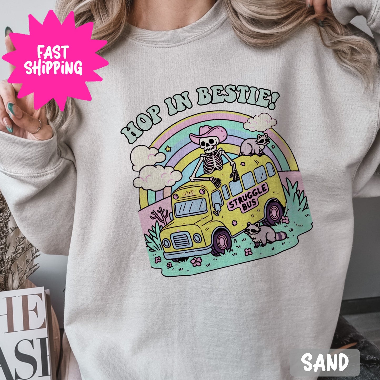 Hop in Bestie Struggle Bus Crewneck Sweatshirt, Cute Skeleton Raccoon Unisex Cozy Pullover, Fun Graphic Sweatshirt