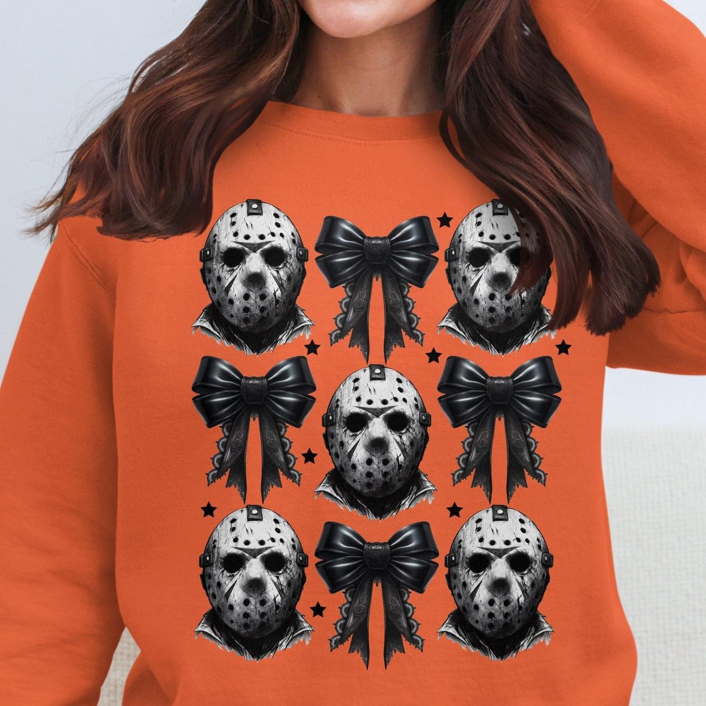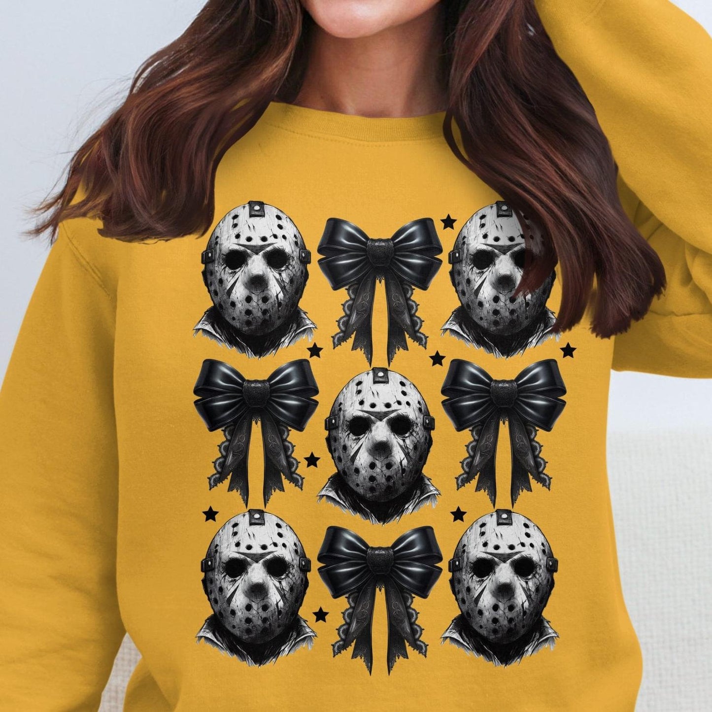 This Horror Movie Mask Sweatshirt features a striking design of a creepy movie mask paired with elegant black bows. Perfect for horror enthusiasts and a stylish choice for Halloween or any spooky event. Made for comfort and style, it's an ideal gift for fans of horror movies.
