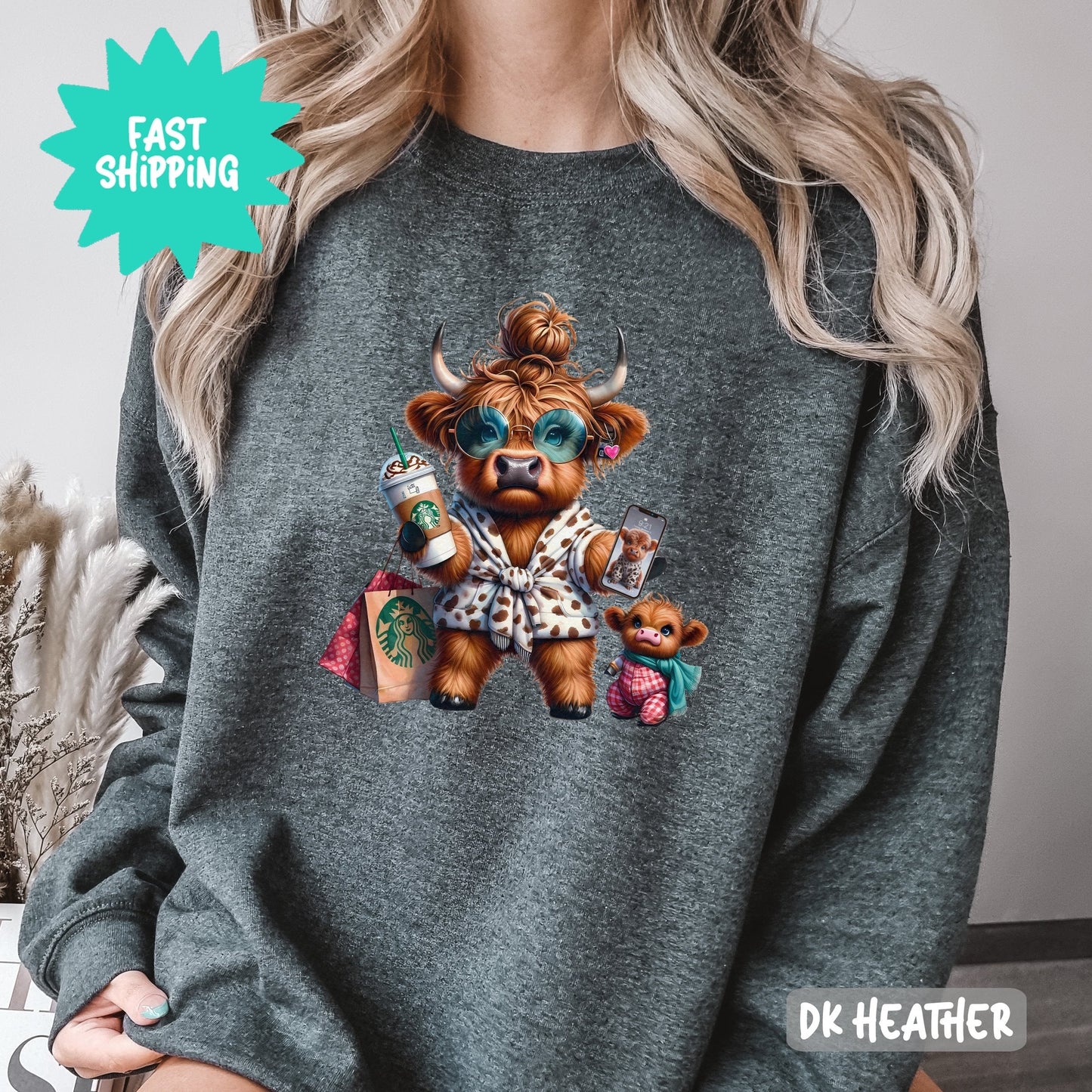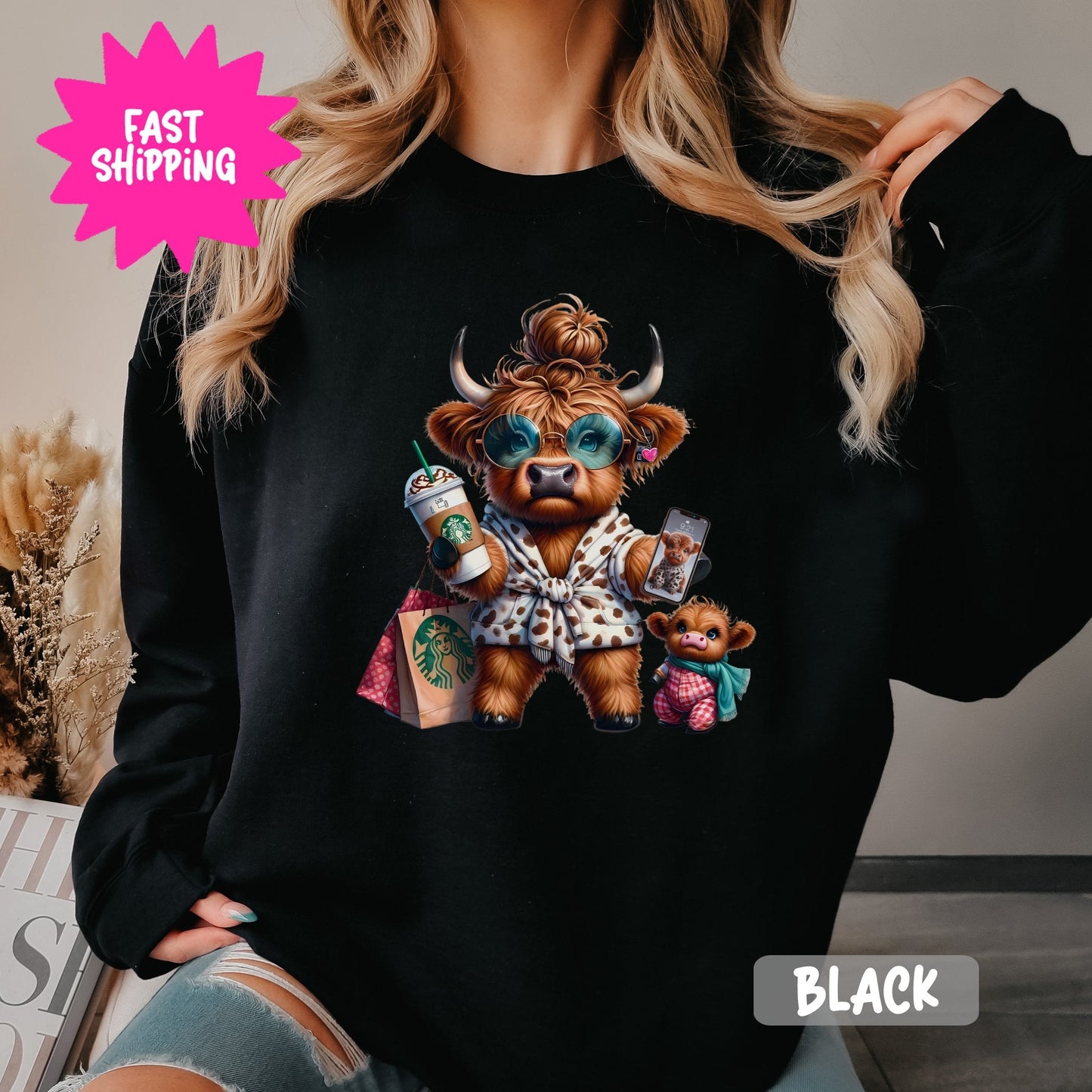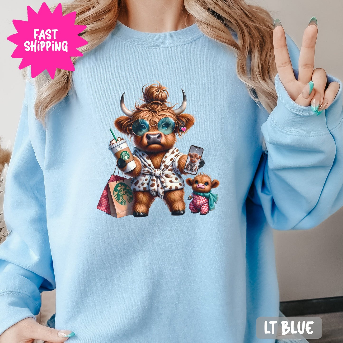 Hot Mess Mom Highland Cow With Starbucks Crewneck Sweatshirt, Shopping Bags and Phone, Gift for Mom