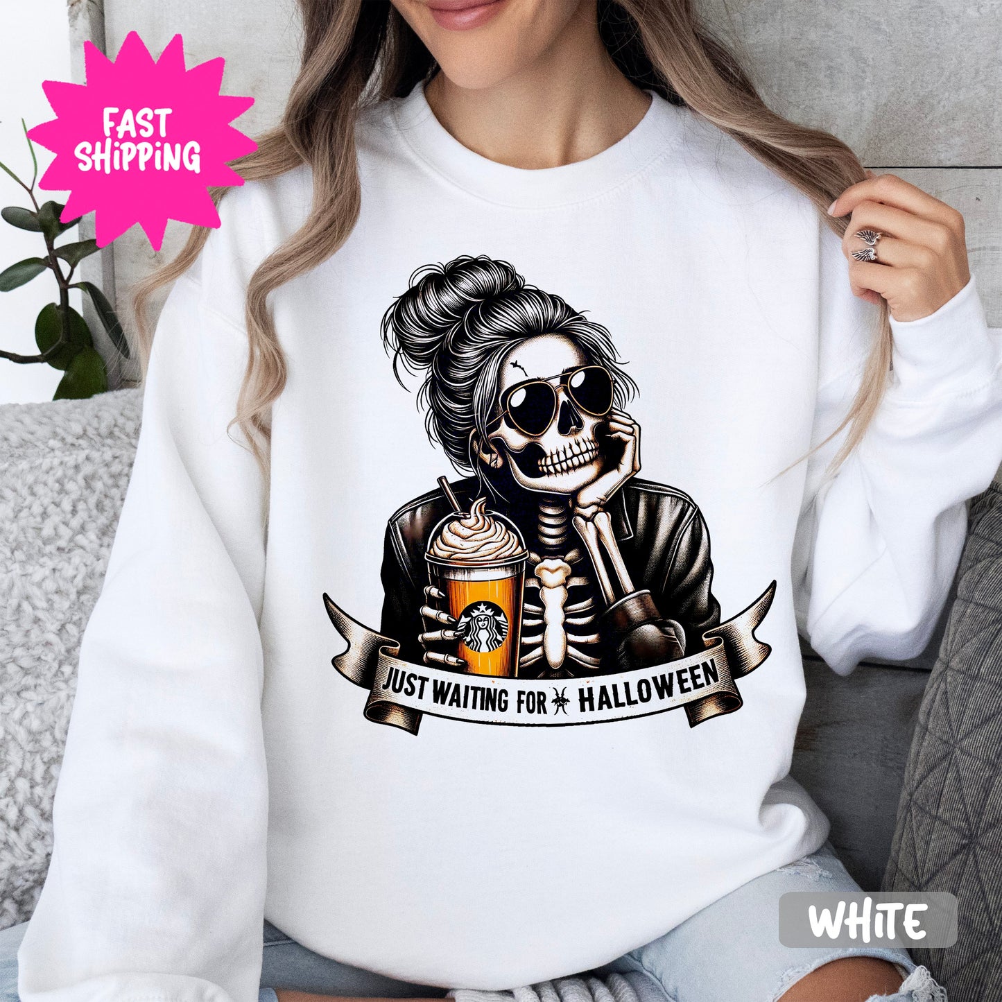 Stand out this Halloween season with our Just Waiting For Halloween Skull Graphic Sweatshirts featuring a stylish skeleton sipping coffee