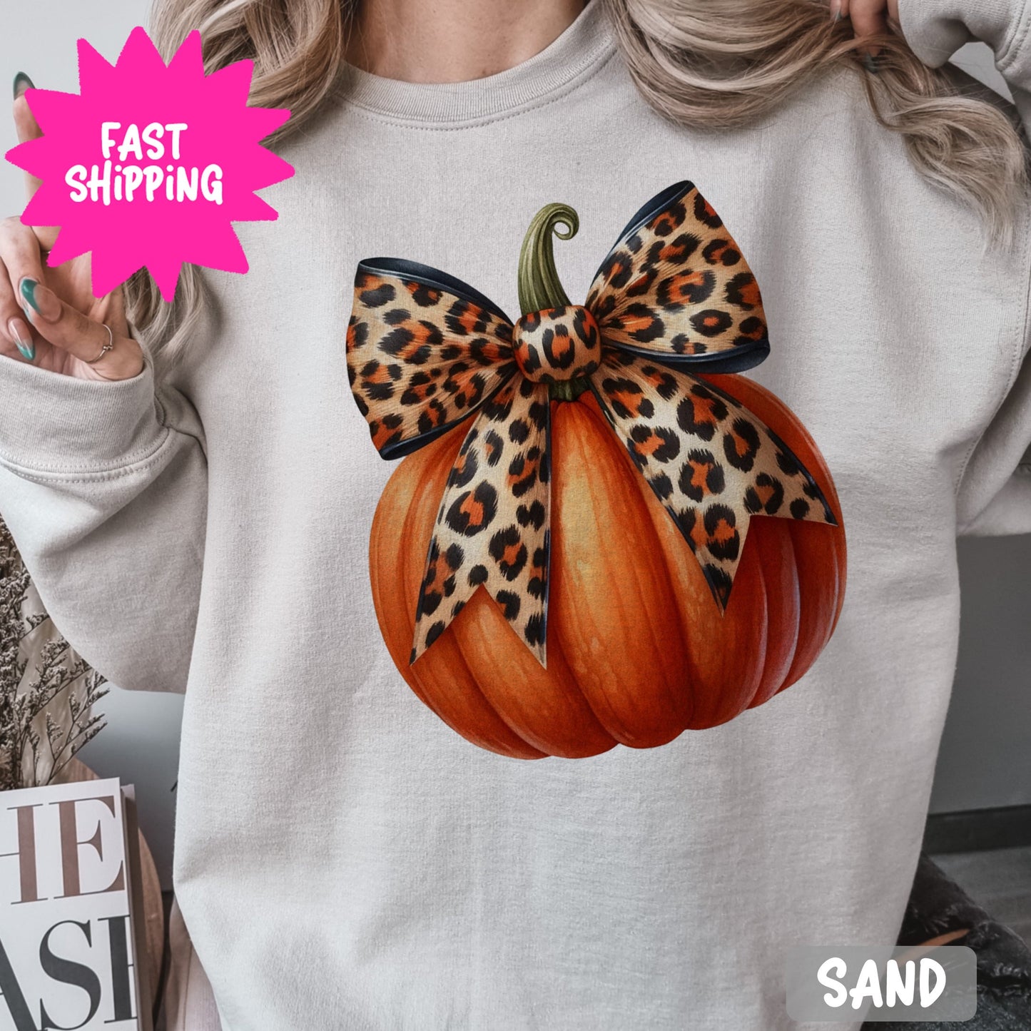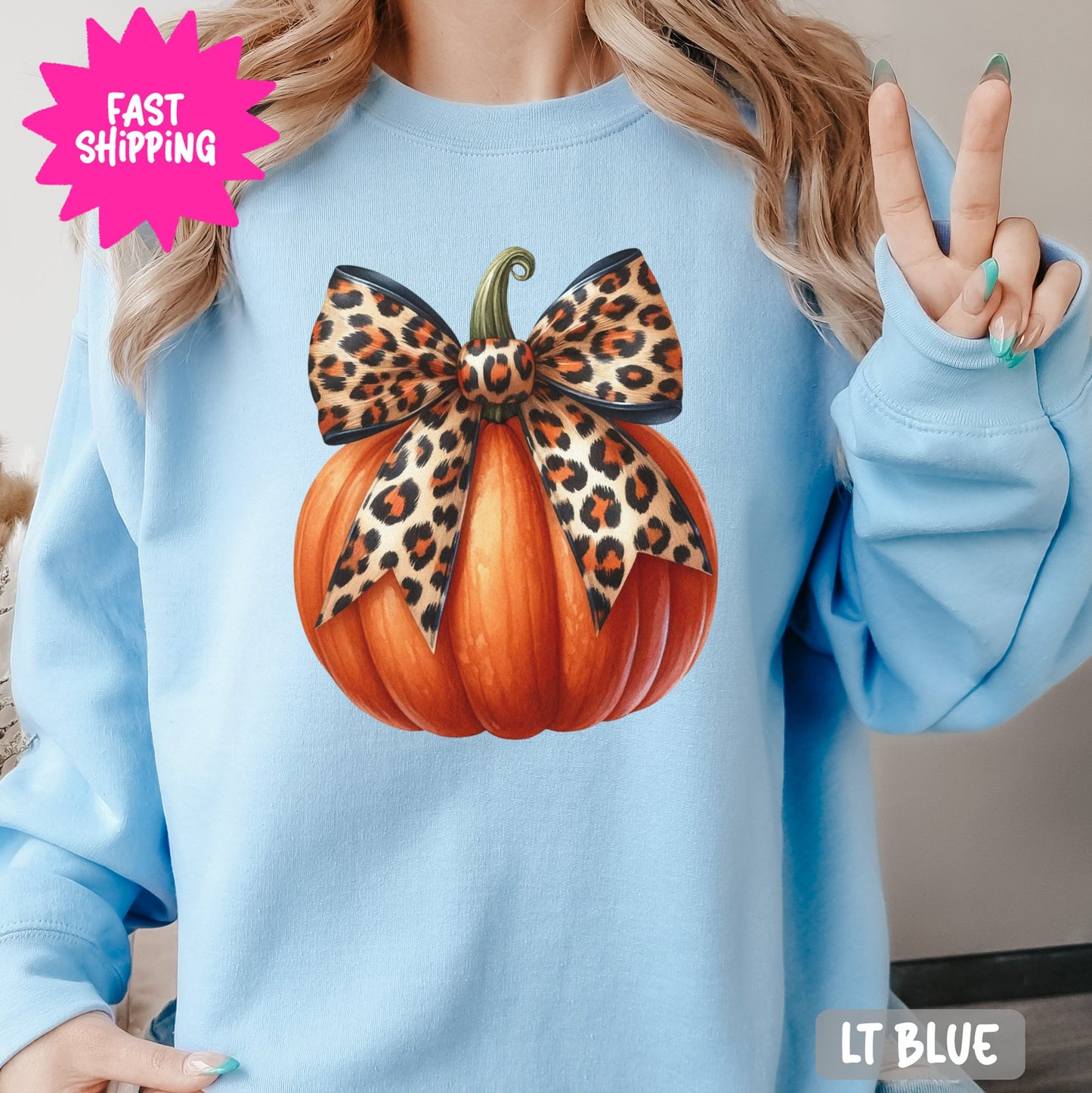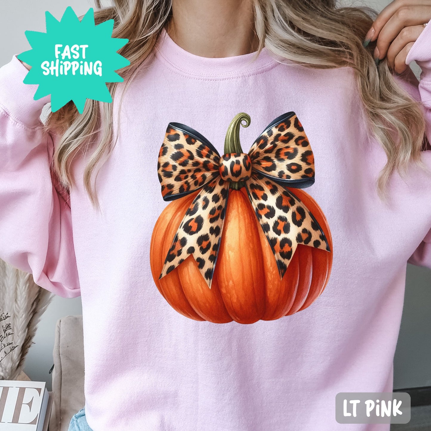 Leopard Print Bow Pumpkin Sweatshirt, Trendy Fall Crewneck Sweatshirt, Cozy Autumn Fashion, Cute Halloween Top