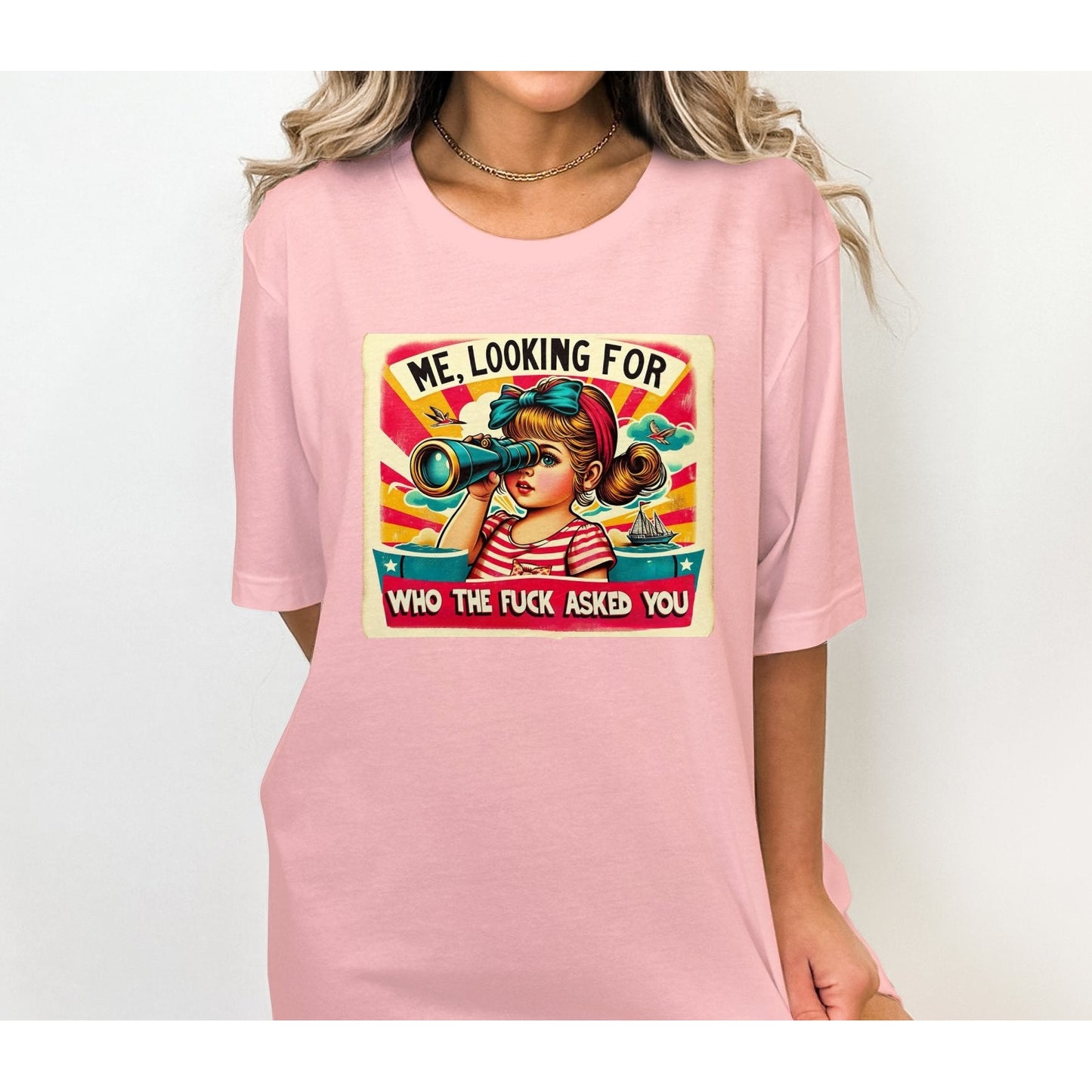 This Me Looking For Who The Fuck Asked You T-Shirt features a funny retro graphic design. Perfect for casual wear, this humorous shirt makes a bold statement and adds a touch of vintage charm to your wardrobe. Great gift for friends or family who appreciate bold and quirky designs.