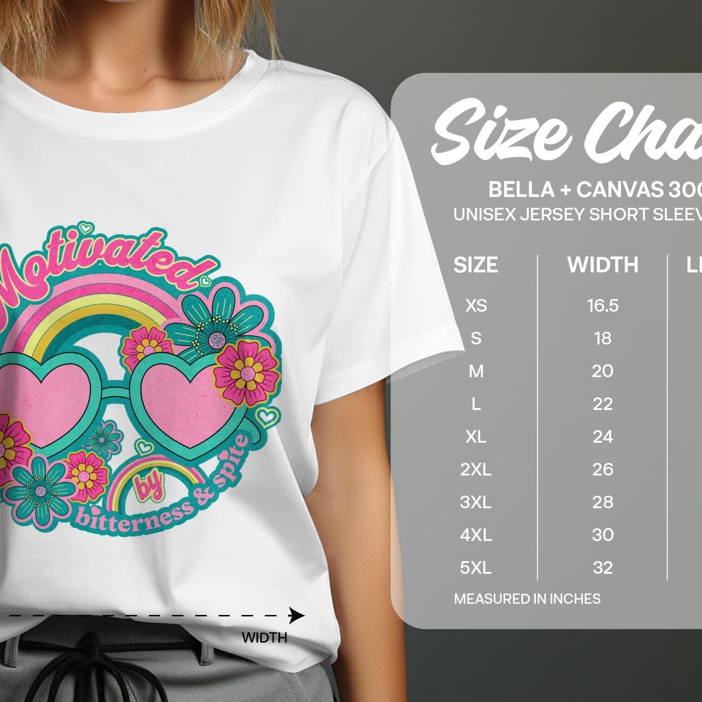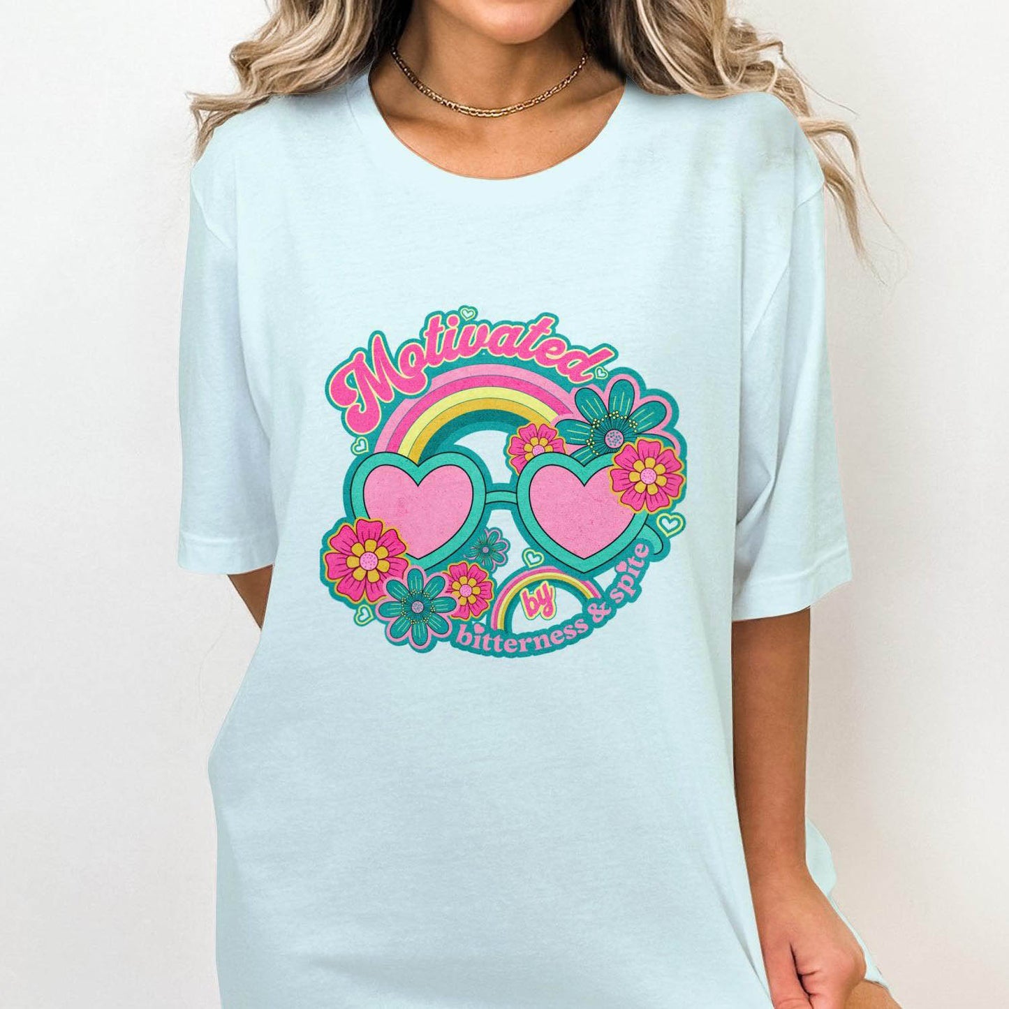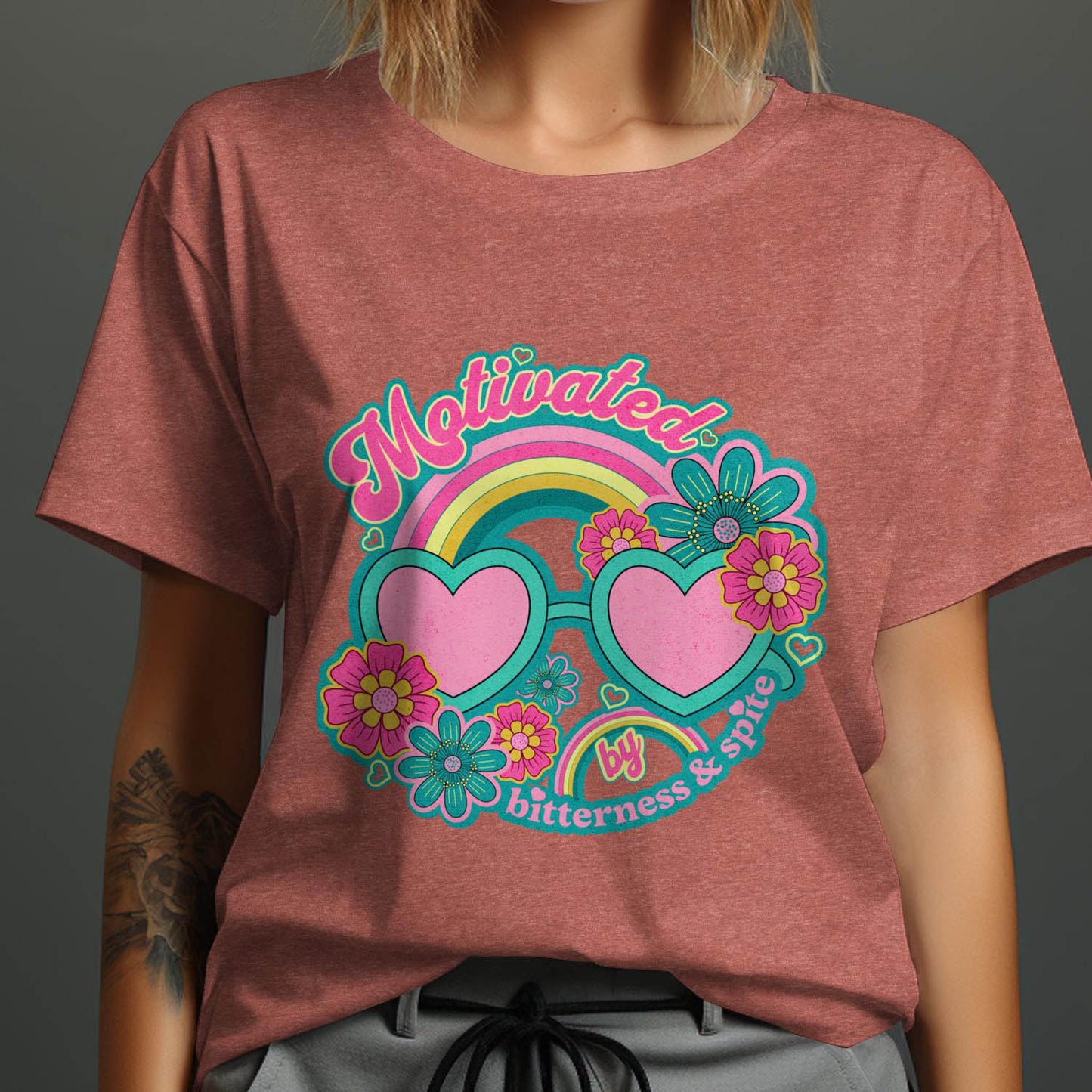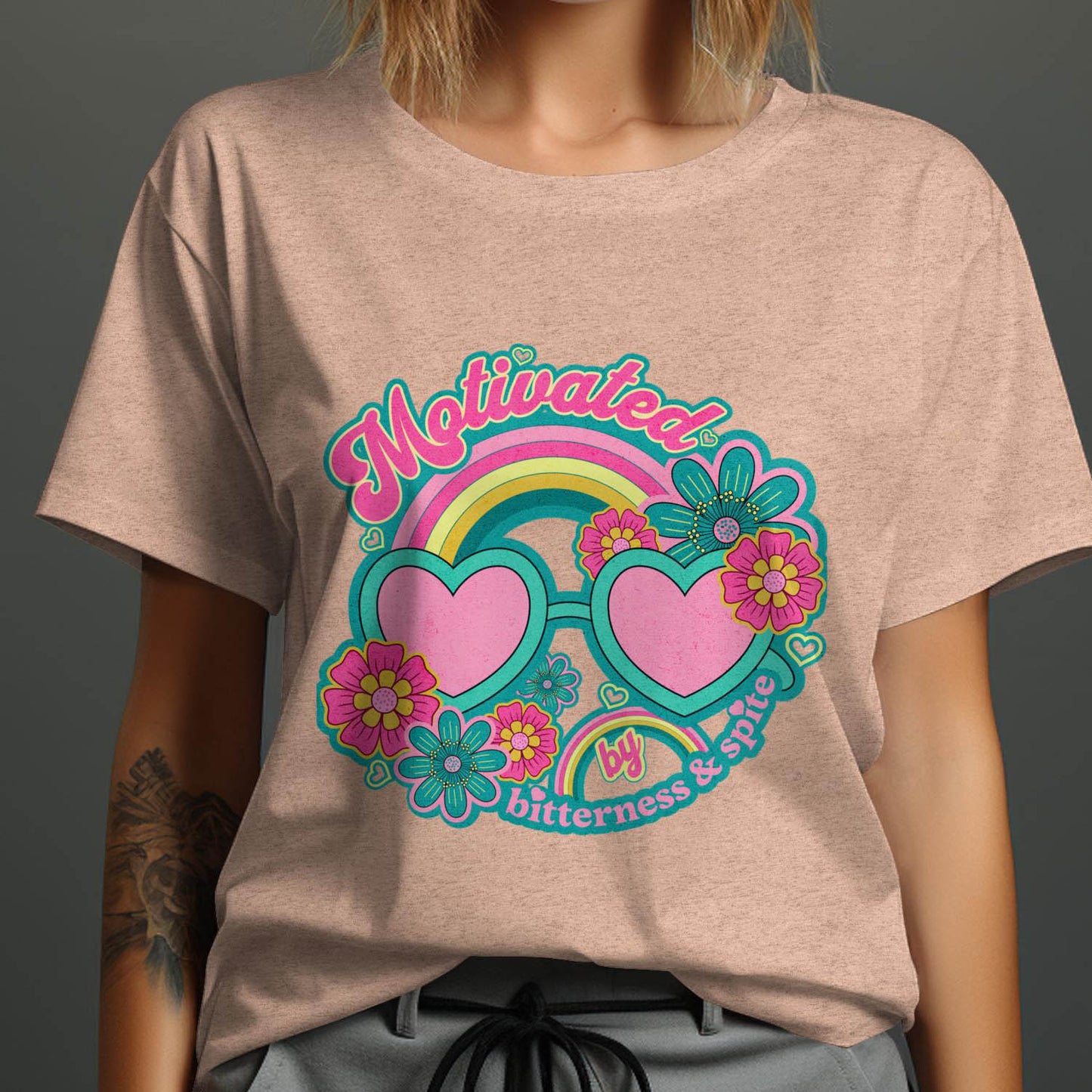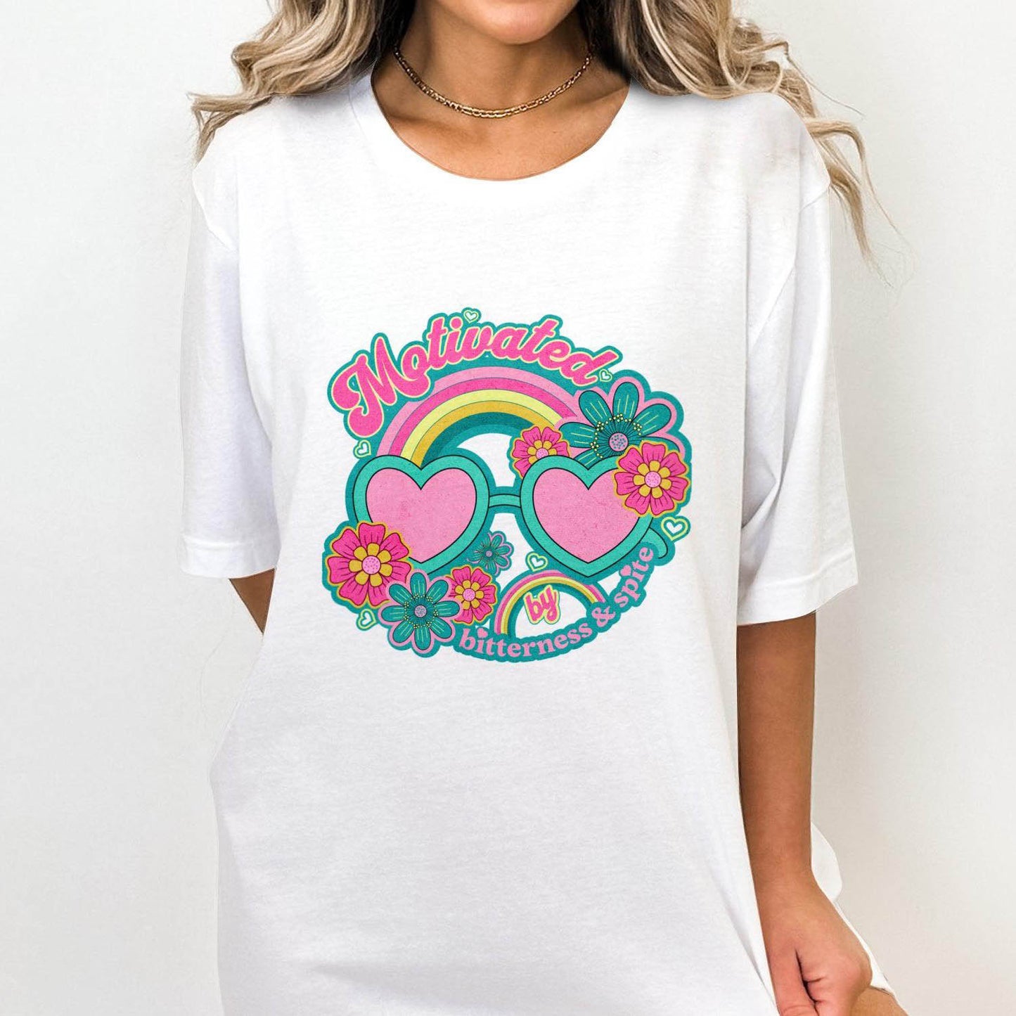 Embrace a fun and retro aesthetic with this "Motivated by Bitterness and Spite" graphic T-shirt. Featuring heart-shaped sunglasses, colorful flowers, and a vibrant rainbow, this T-shirt is perfect for adding a playful touch to any casual outfit. Ideal for those who love unique and quirky designs, this tee is sure to make a bold statement. Great for casual wear or as a gift for friends who appreciate humor and style.