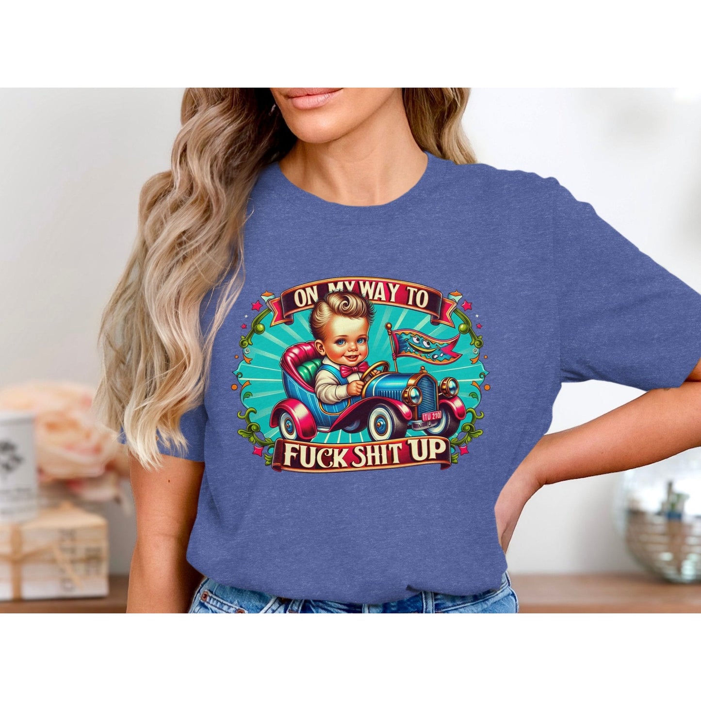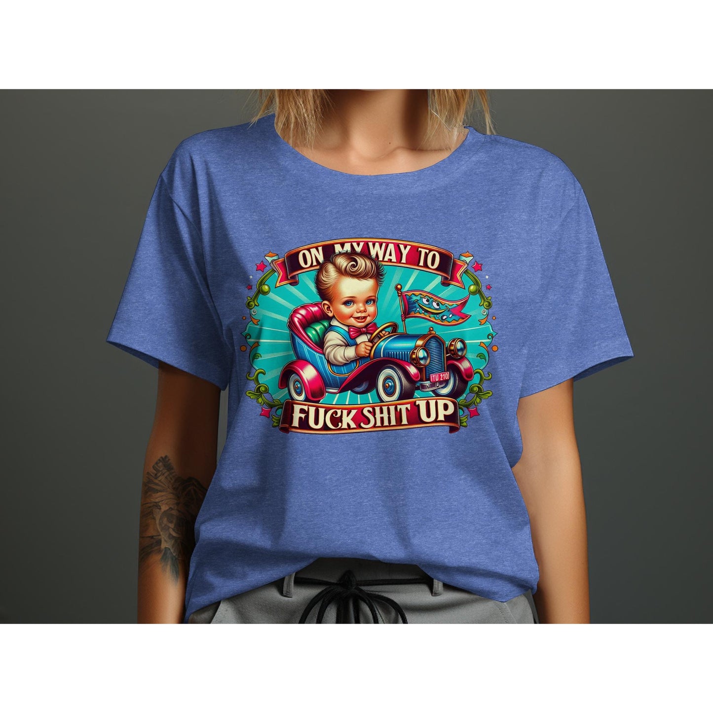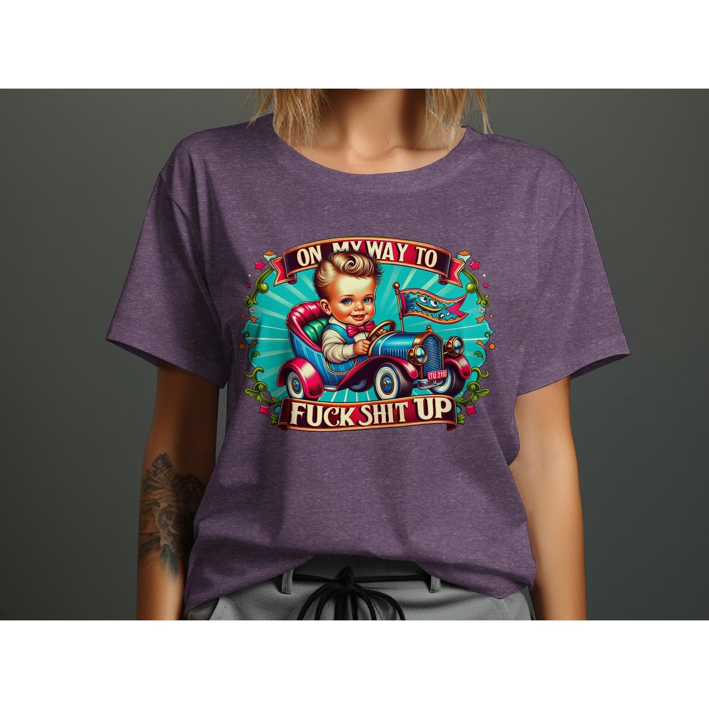 This hilarious retro-style T-shirt features an eye-catching graphic of a kid driving a vintage car with the bold statement "On My Way To F*ck Sh*t Up." Ideal for those who love unique and edgy designs, this tee is perfect for casual outings, parties, or gifting to friends with a great sense of humor. Stand out and express your personality with this fun and bold statement shirt.