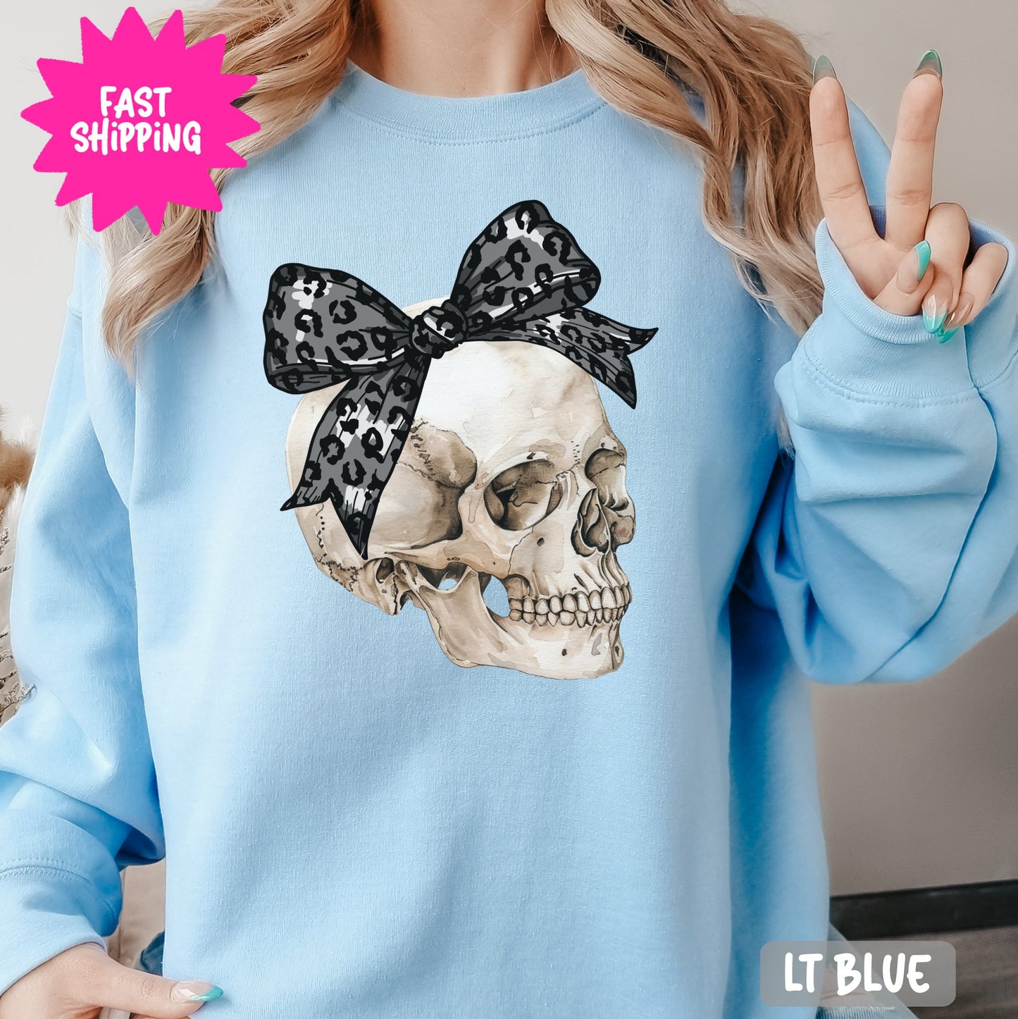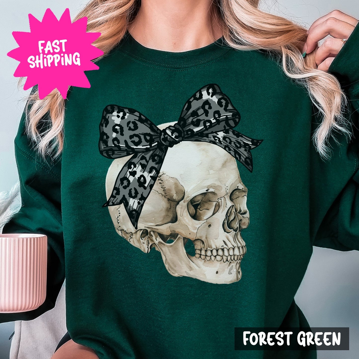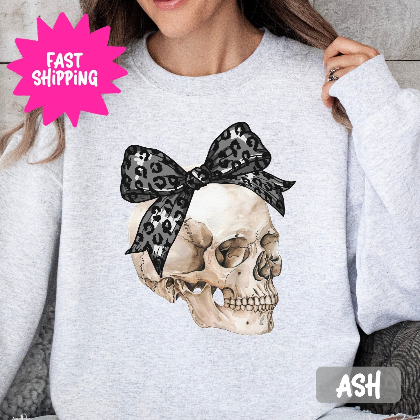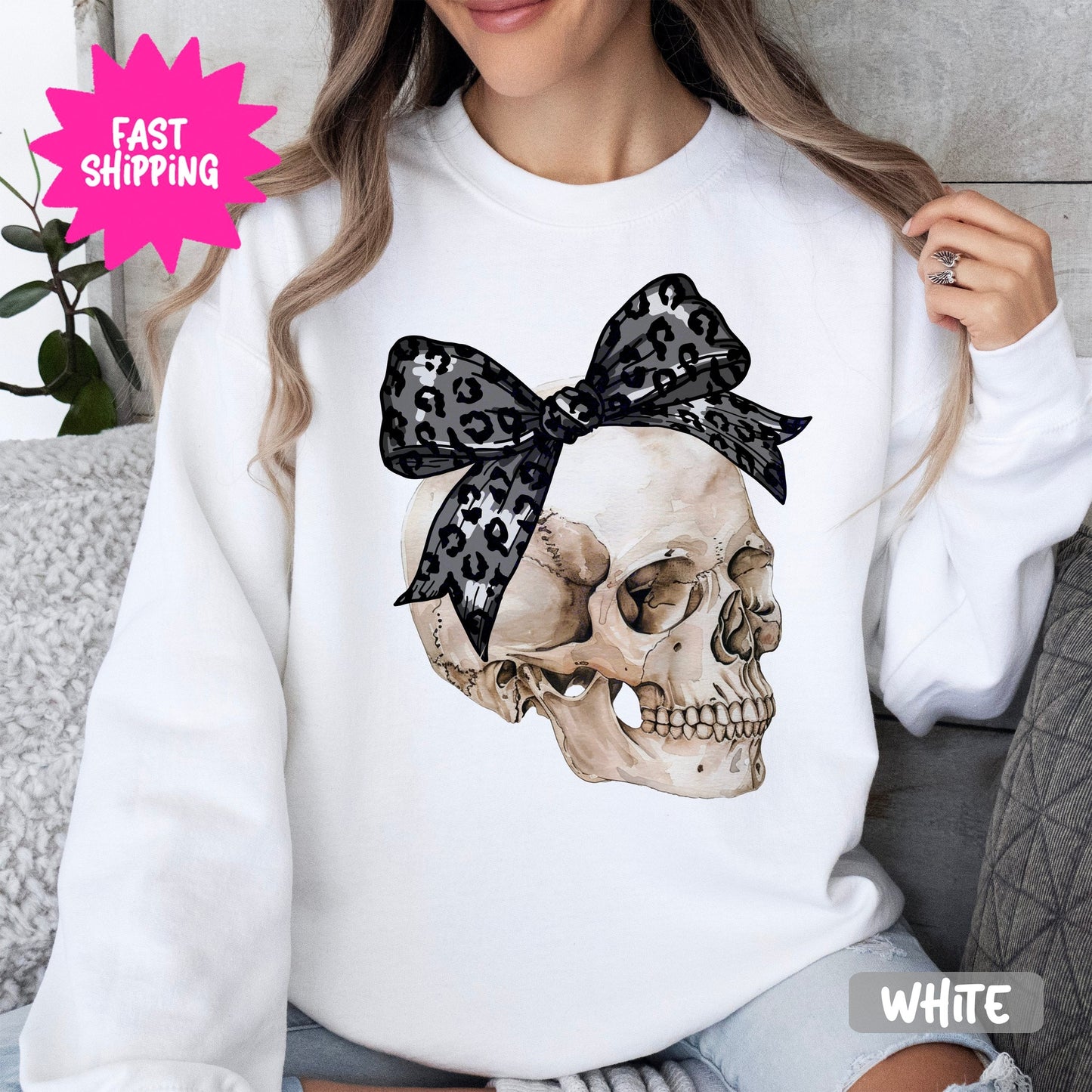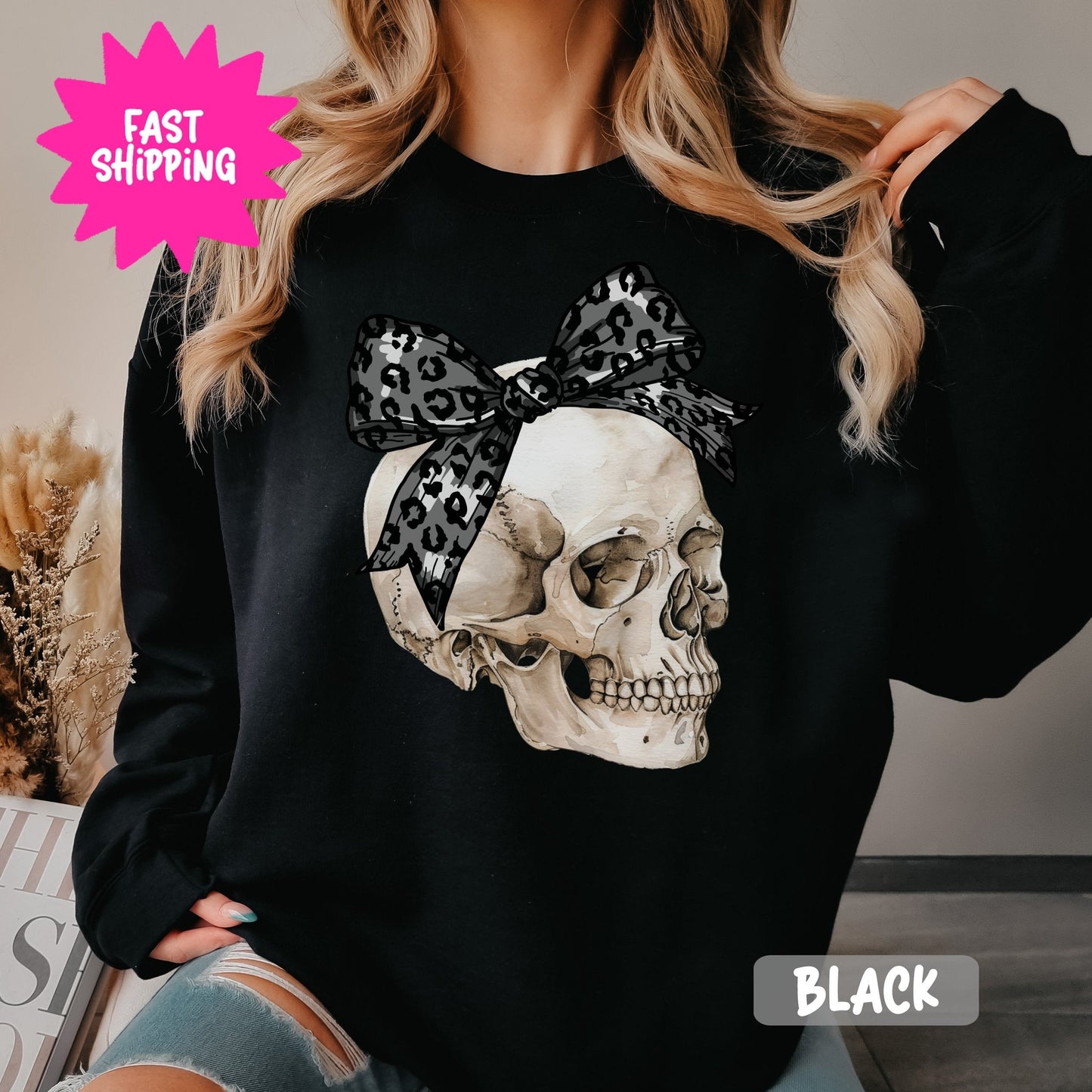 Unique skull with leopard print bow sweatshirts adds a bold statement to your style The edgy design is perfect for making a fashion-forward impression