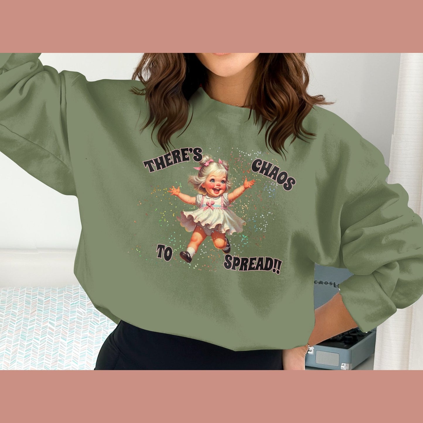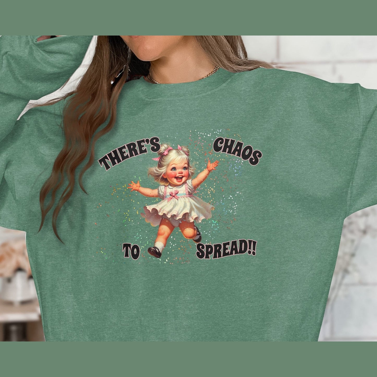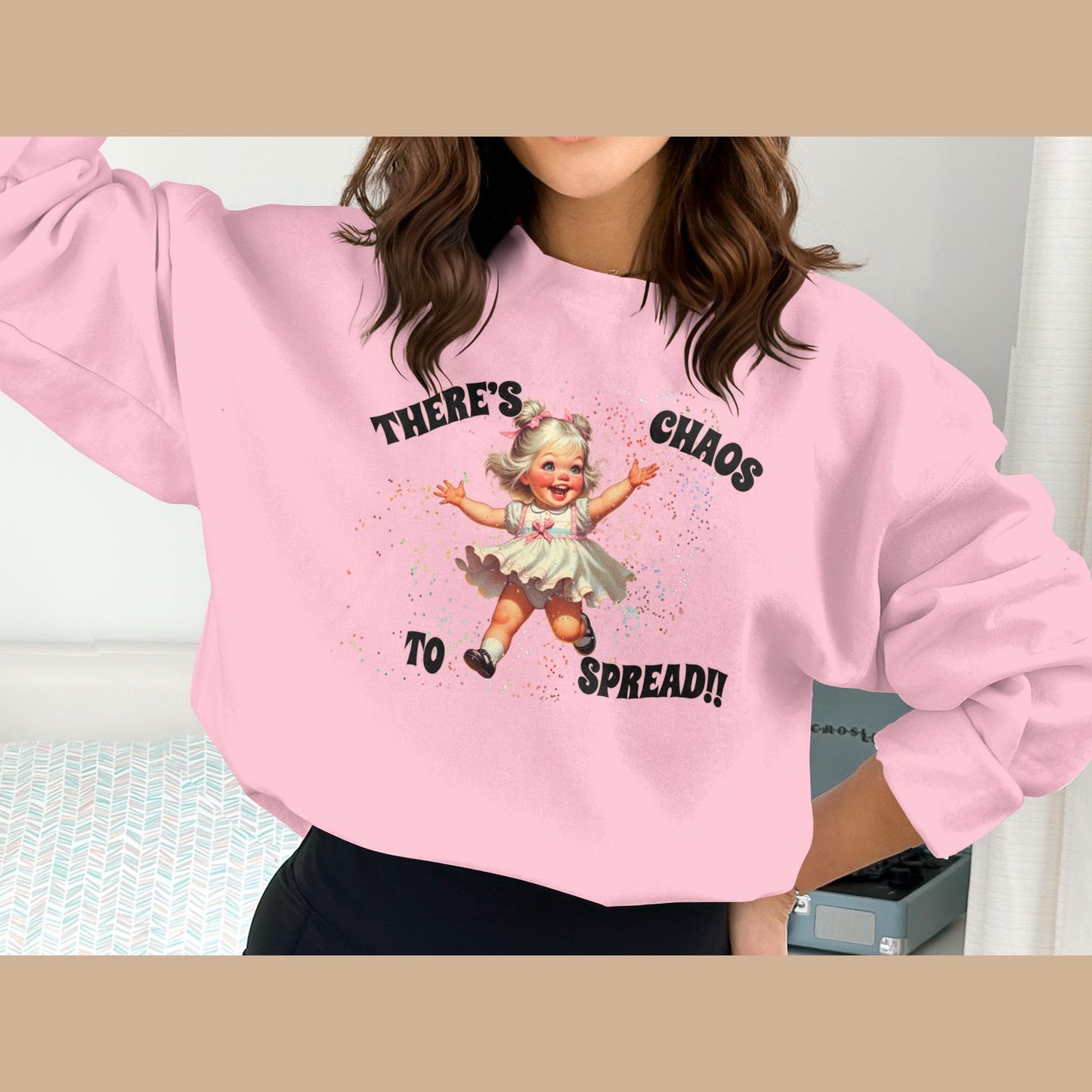 Enjoy the vintage charm with our There's Chaos to Spread Crewneck Pullover Sweatshirts. Perfect for those who love to express themselves with a touch of humor.