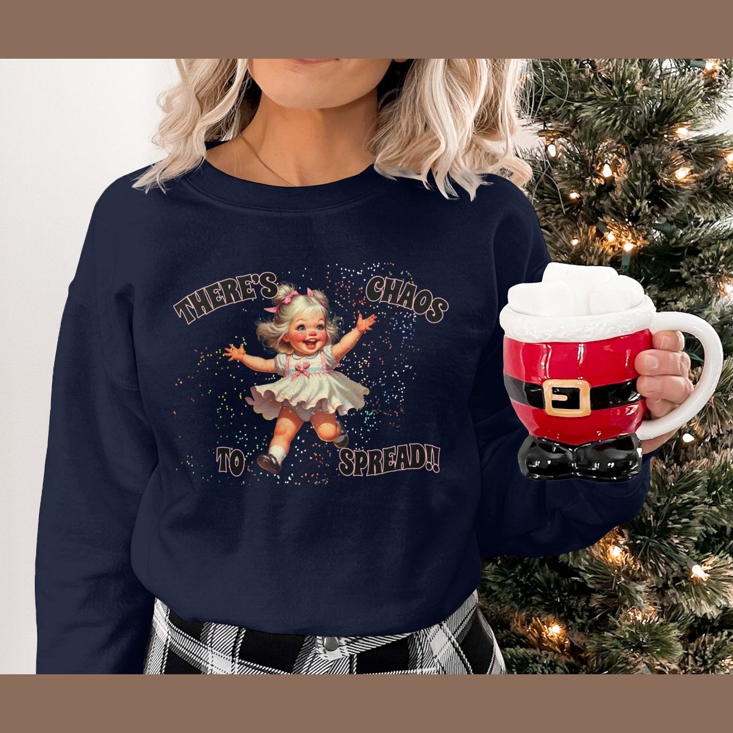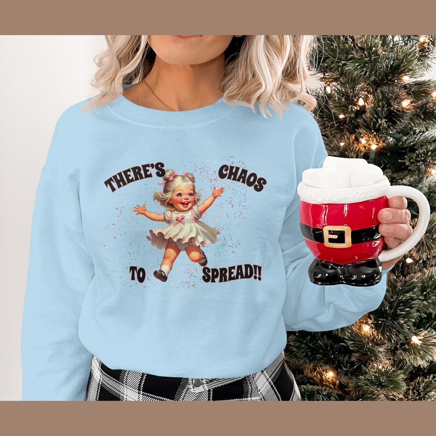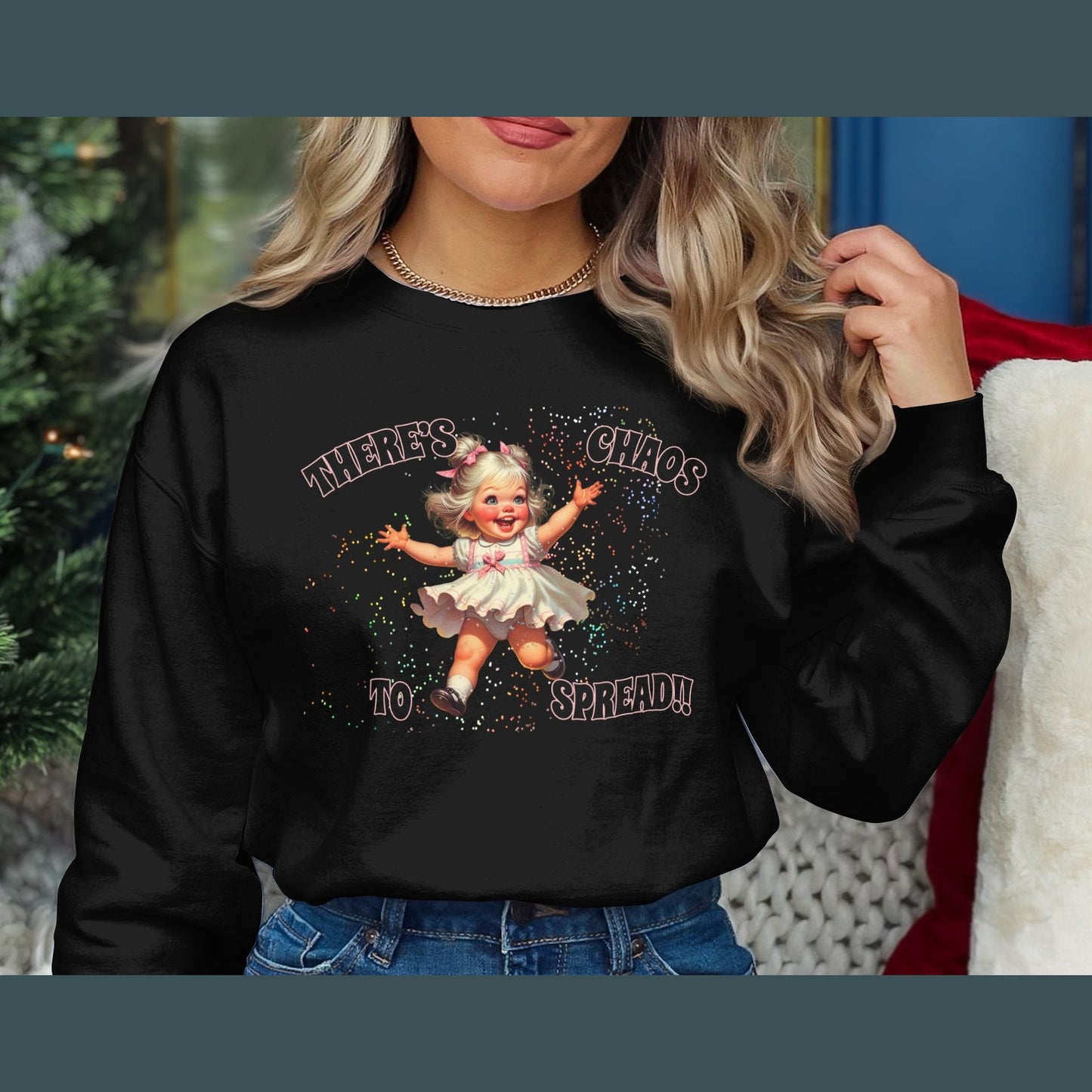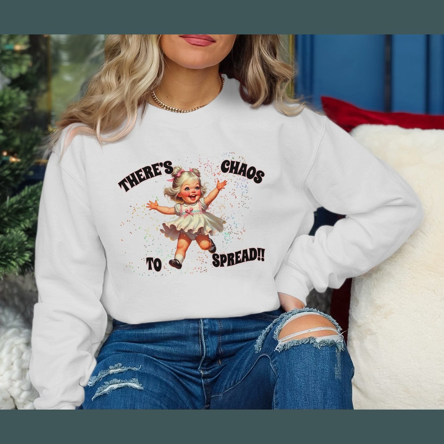 Enjoy the vintage charm with our There's Chaos to Spread Crewneck Pullover Sweatshirts. Perfect for those who love to express themselves with a touch of humor.