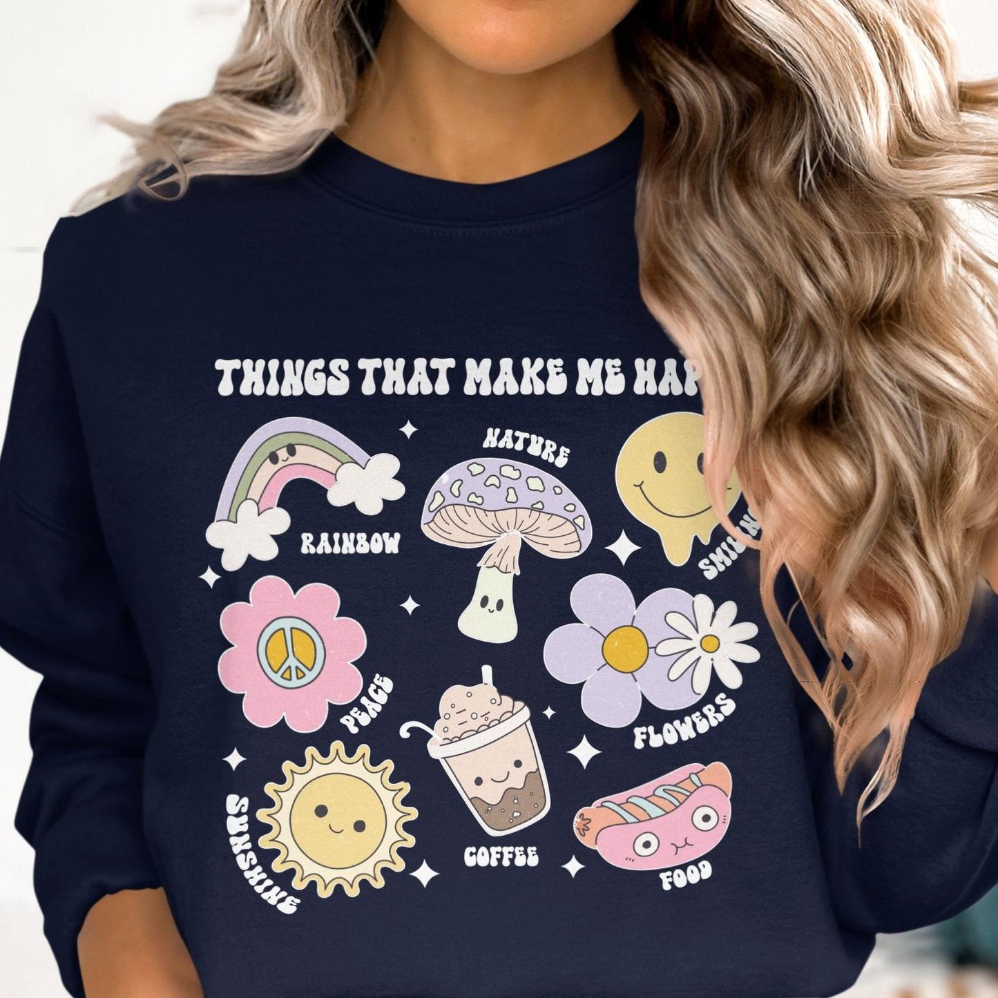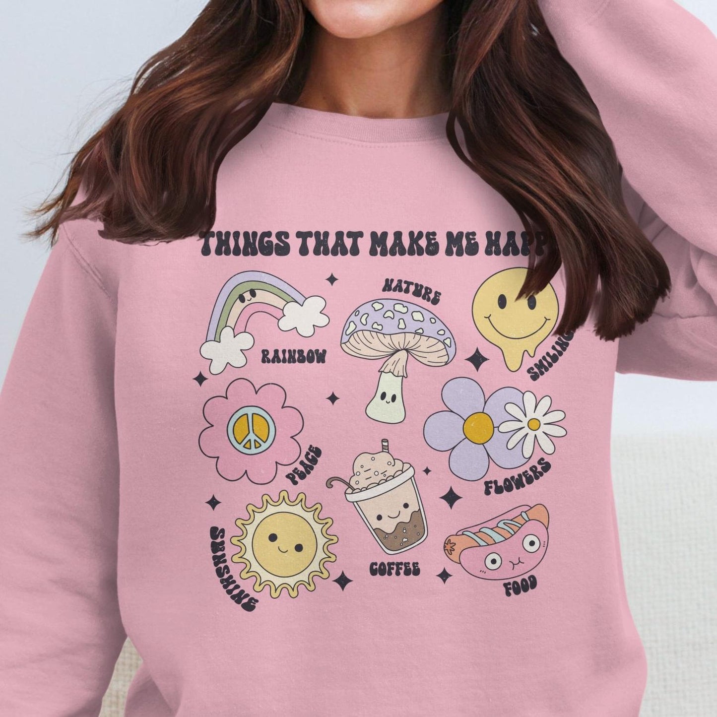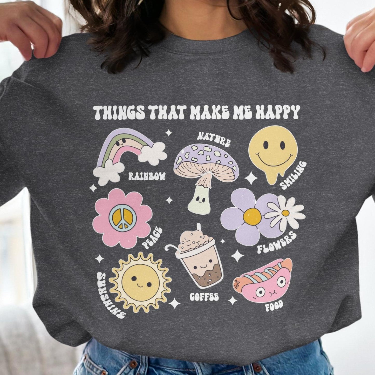 Things That Make Me Happy Sweatshirt, Sweatshirt, Rainbow Smiling Design, Cute Graphic Tee, Nature Inspired Apparel, Fun Colorful